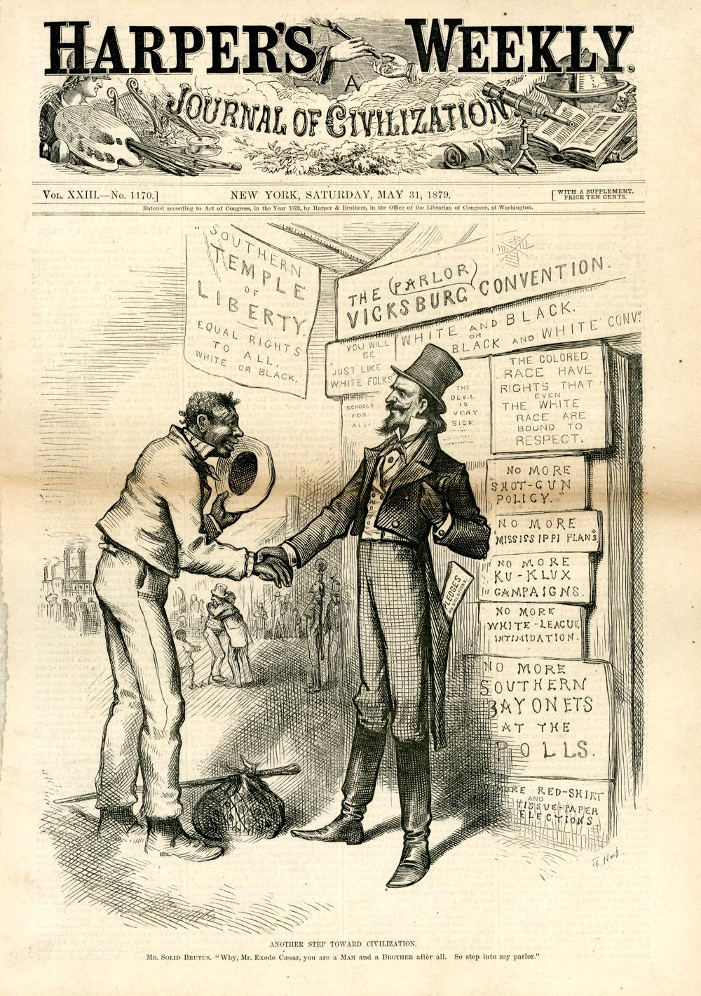Another step toward civilization. Mr. Solid Brutus. "Why, Mr. Exode Caesar, you are a Man and a Brother after all. So step into my parlor." : ein Südstaatler versucht, einen Afroamerikaner, der auswandern möchte, durch Freundlichkeit und Versprechungen zurückzuhalten. [In der Zeichnung befinden sich mehrere Textblöcke] / Th. Nast