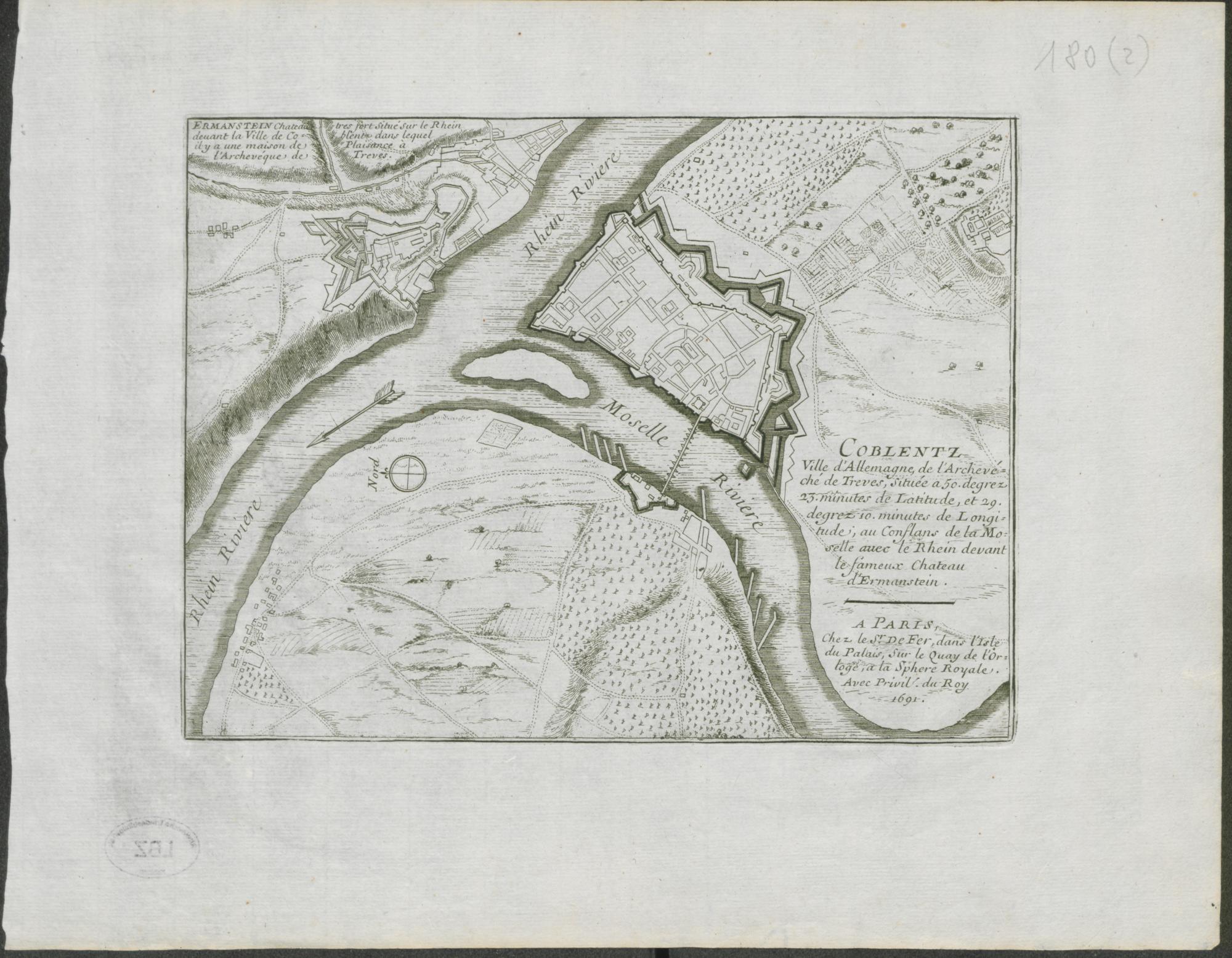 Coblentz : Ville d'Alemagne, de l'Archevéché de Treves, Située a 50. degrez 23. minutes de Latitude, et 29. degrez. 10 minutes de Longitude, au Conflans de la Moselle avec le Rhein devant le fameux Chateau d'Ermanstein ; Avec Privil. du Roy / Nicolas de Fer