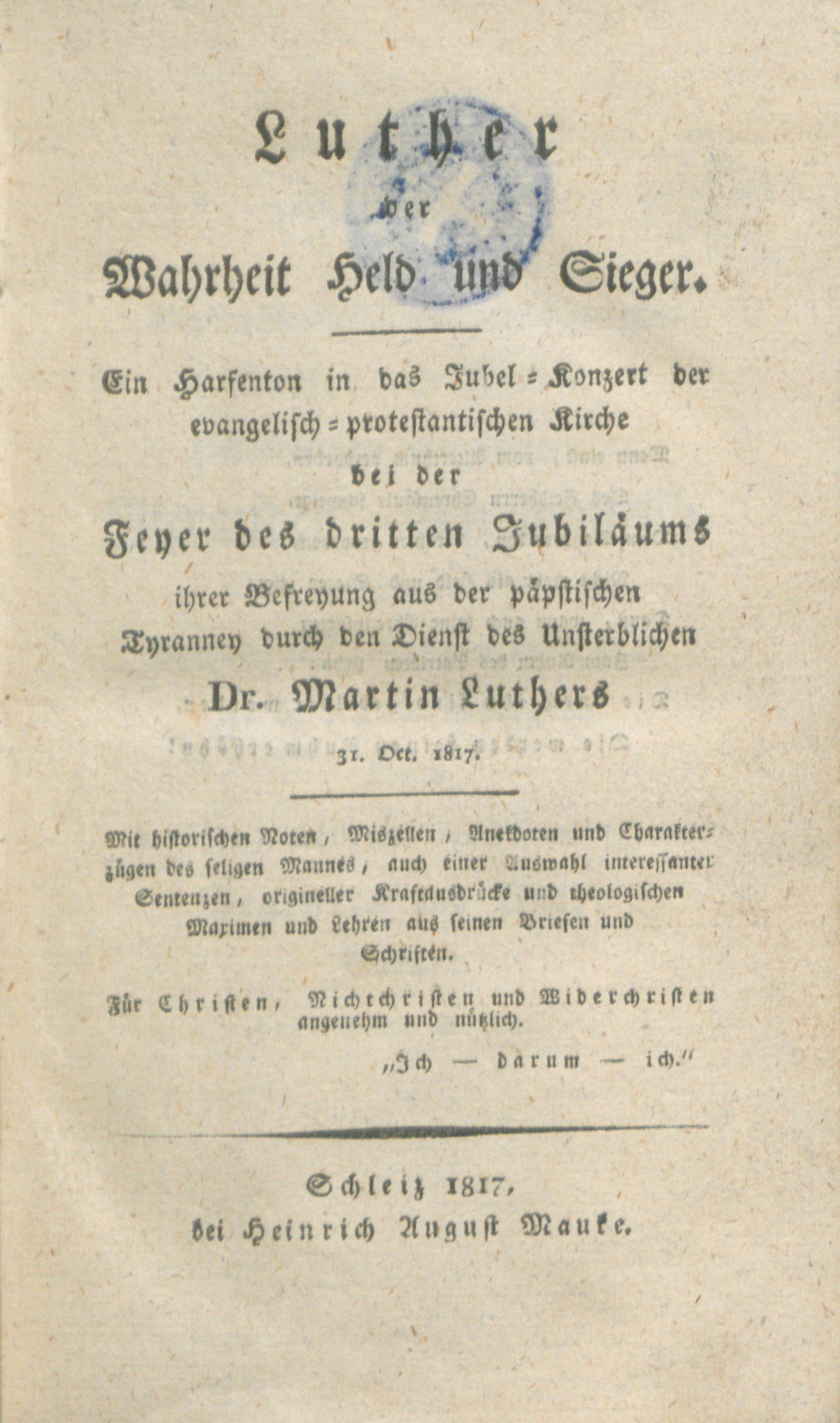 Luther der Wahrheit Held und Sieger : Ein Harfenton in das Jubel-Konzert der evangelisch-protestantischen Kirche bei der Feyer des dritten Jubiläums ihrer Befreyung aus der päpstlichen Tyranney durch den Dienst des Unsterblichen Dr. Martin Luthers 31. Oct. 1817. Mit historischen Noten, ... Für Christen, Nichtchristen und Widerschriften angenehm und nützlich