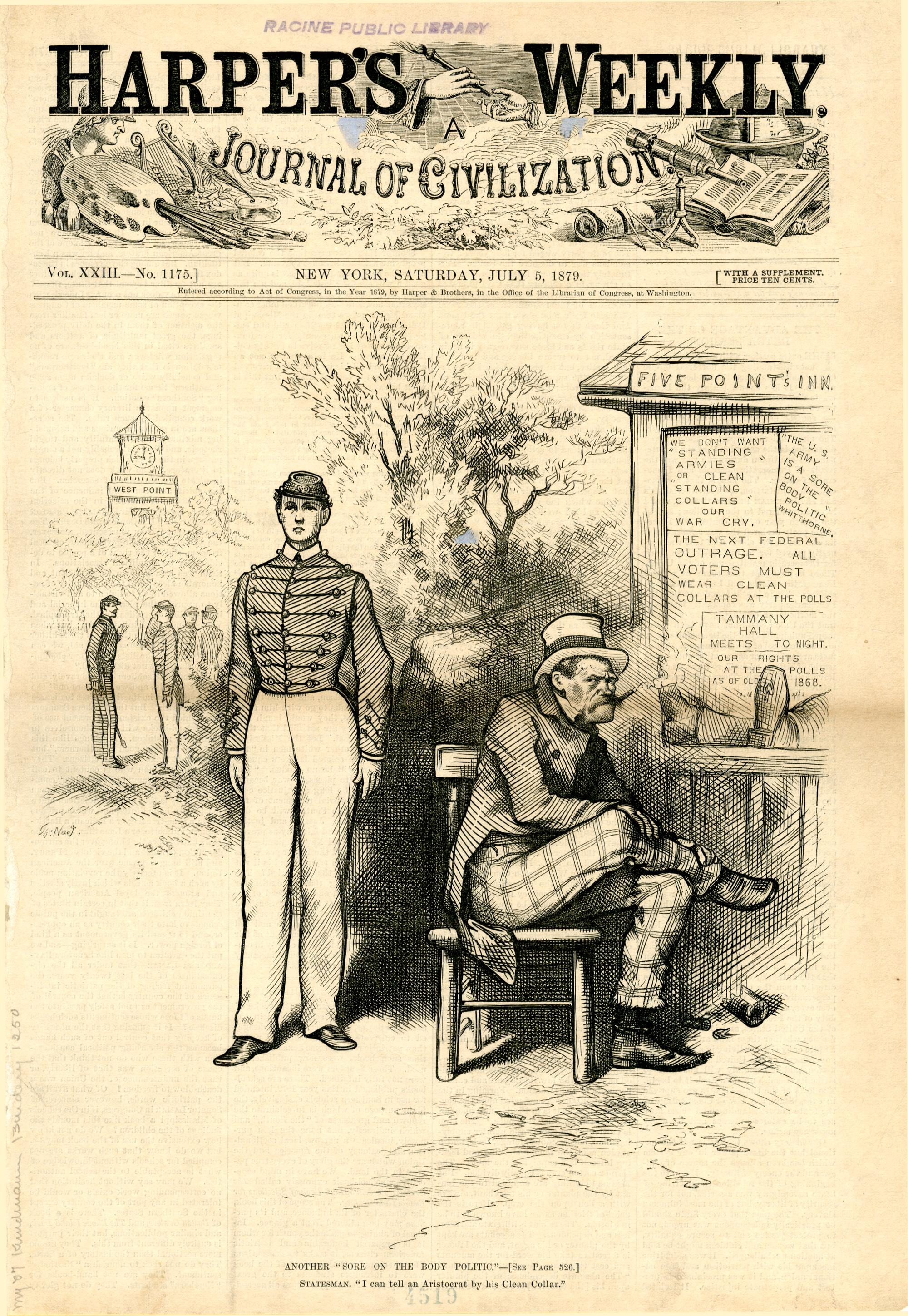 Another "sore of the body politic." Statesman. "I can tell an Aristocrat by his Clean Collar." : ein verwahrlost ausssehender Politiker erregt sich über das gepflegte Aussehen eines Kadetten der Militärakademie West Point (zu S. 526) / Th. Nast