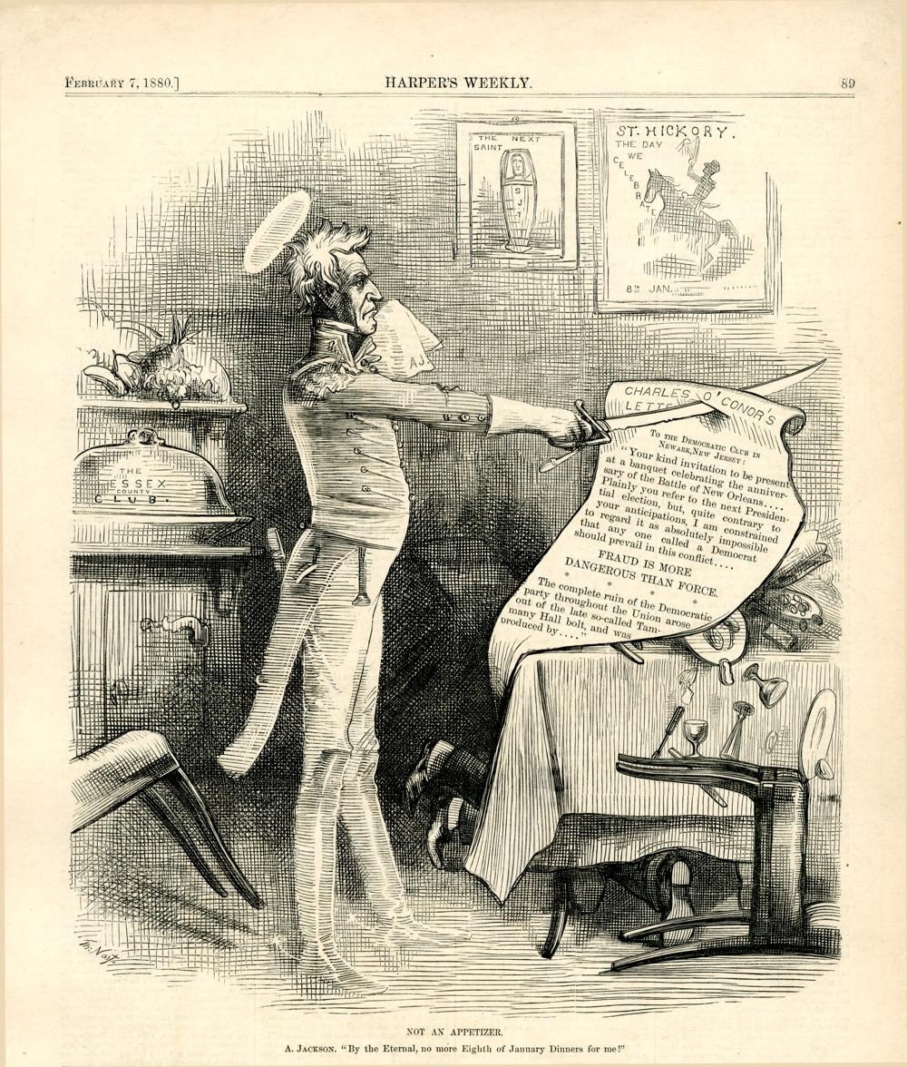 Not an appetizer. A. Jackson. "By the Eternal, no more Eighth of January Dinners for me!" : der Geist von Präsident Andrew Jackson erscheint bei einem Festessen, das die Demokraten ihm zu Ehren geben und spießt einen Brief des Rechtsanwalts Charles O'Coner mit dem Säbel auf, da dieser vor Betrügereien der Demokratischen Partei warnt / Th. Nast