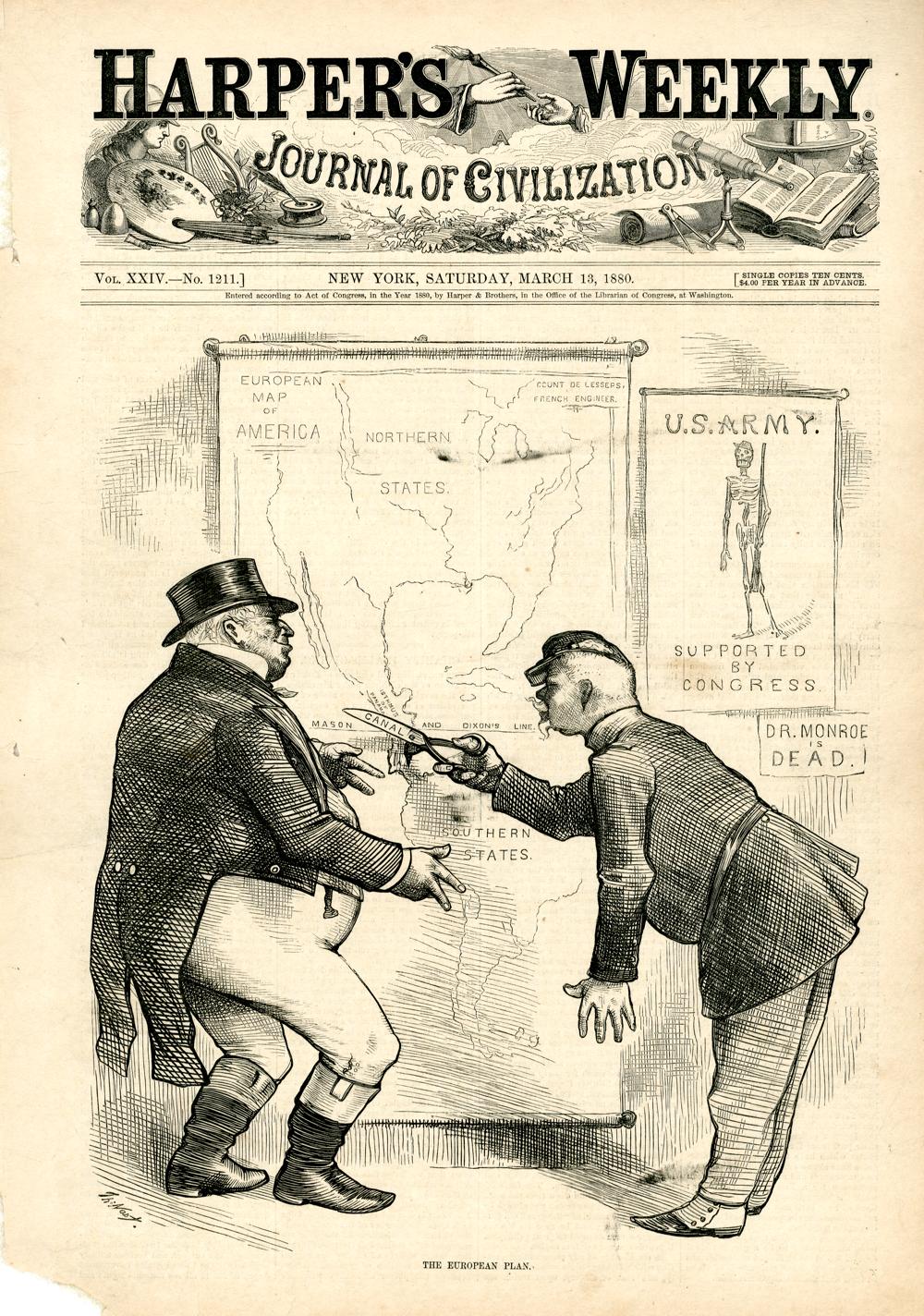 The European plan : Ferdinand de Lesseps zerschneidet auf einer Landkarte unter Anleitung von John Bull den Isthmus von Panama mit einer Schere und trennt dadurch den nordamerikanischen Subkontinent von dem südamerikanischen / Th. Nast