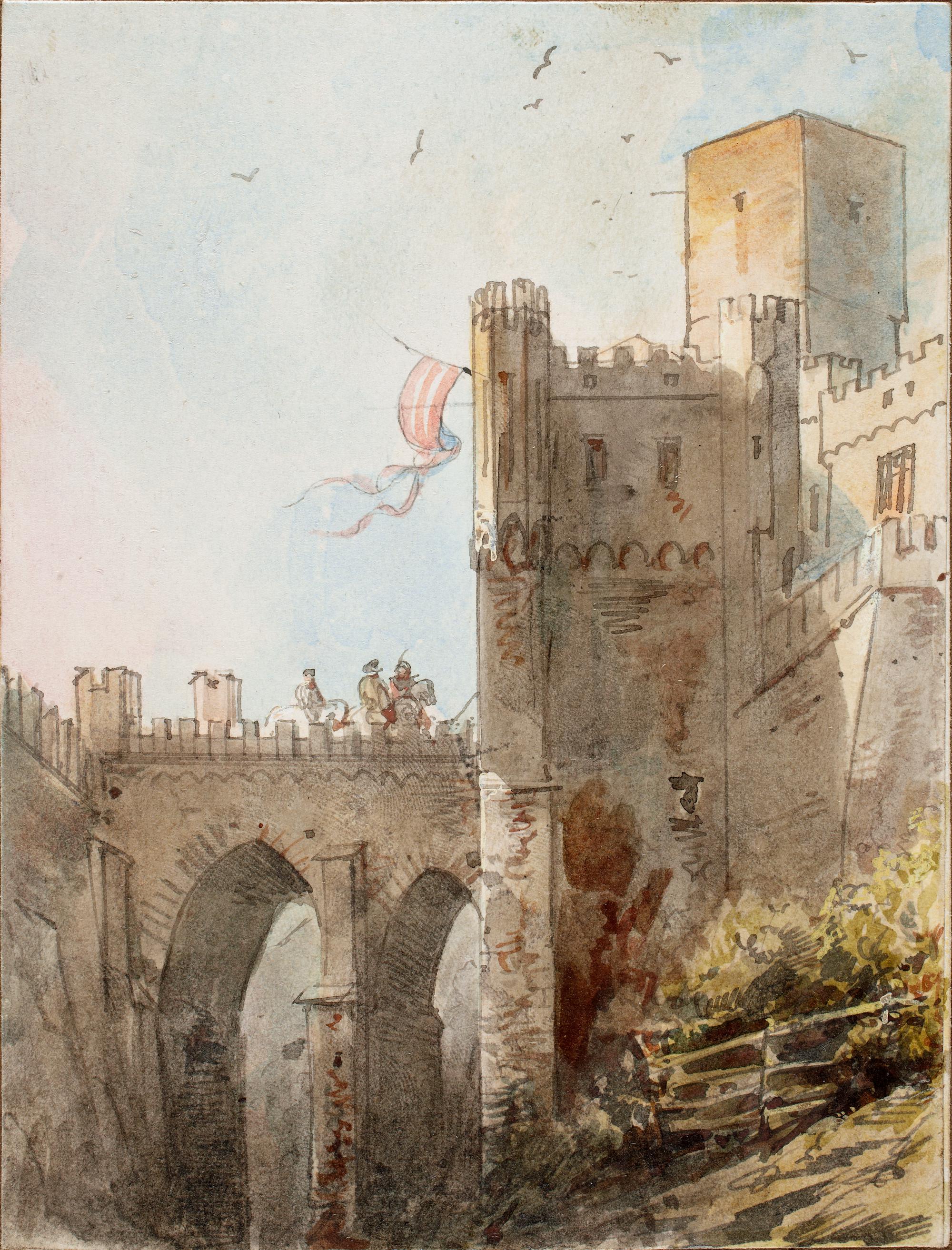 Blick von Osten auf den Eingang zur Burg, auf der Zugbrücke drei Reiter, vor 184...
