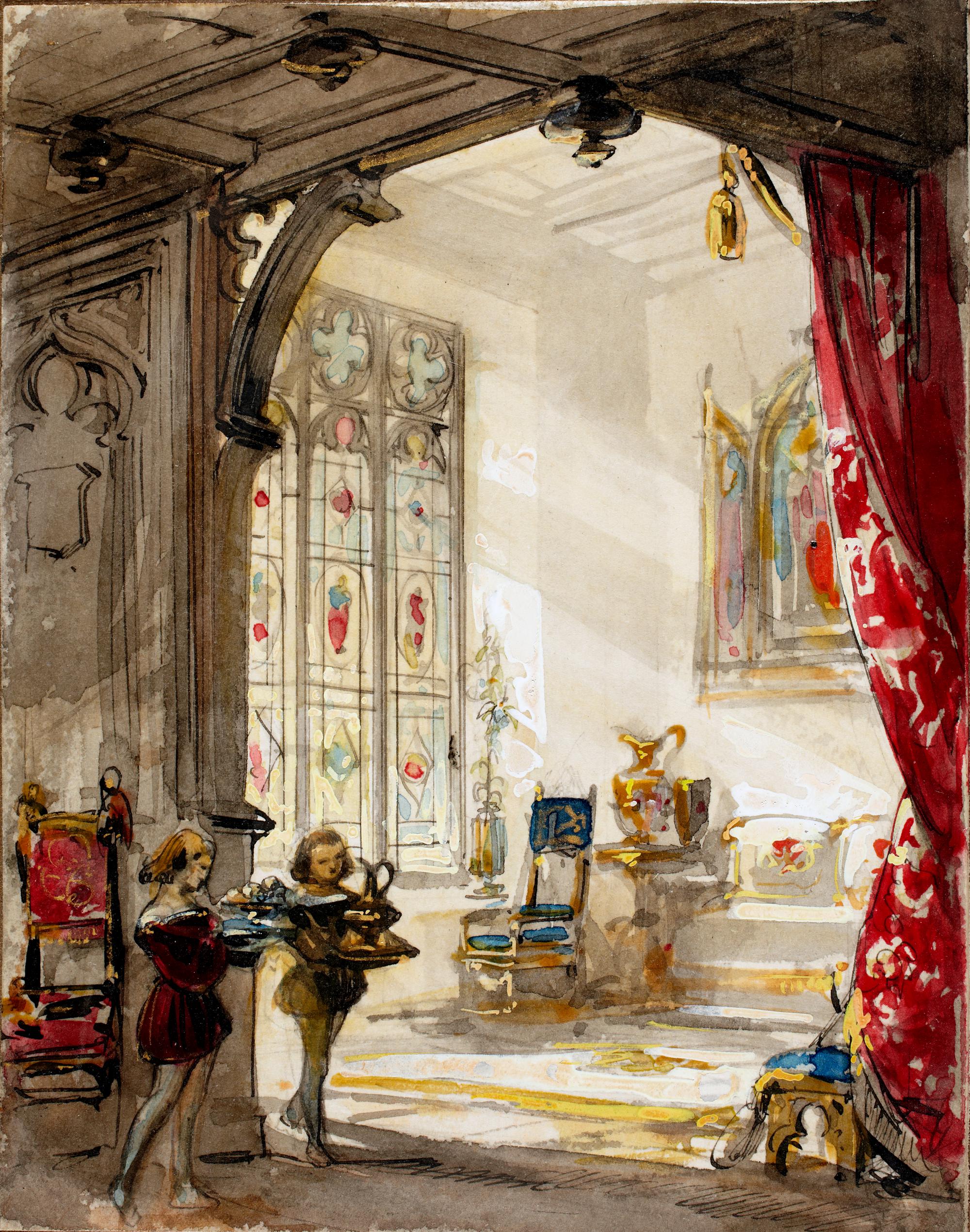 Das Zimmer der Königin, vorne zwei Pagen mit Krügen, unausgeführter Entwurf, um ...