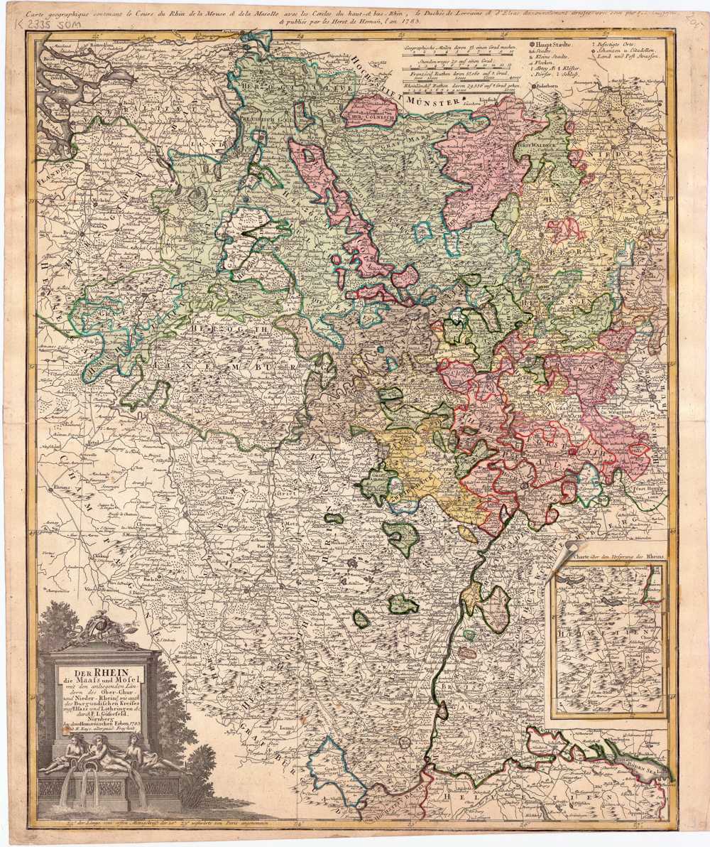 Der Rhein, die Maass und Mosel : mit den anliegenden Ländern des Ober-Chur und Nieder-Rheinl. wie auch des Burgundischen Kreises ingl. Elsass ünd Lothringen &c / durch F. L. Güssefeld. I. M. Schmidt sc. Nor.