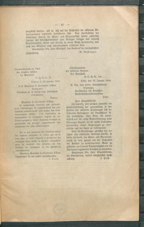 Die Verhandlungen zur Verlängerung des Waffenstillstandes in Trier am 15. und 16. Januar 1919 : nebst dem Briefwechsel zwischen Staatssekretär Erzberger und Marschall Foch / Deutsche Waffenstllstandskommission