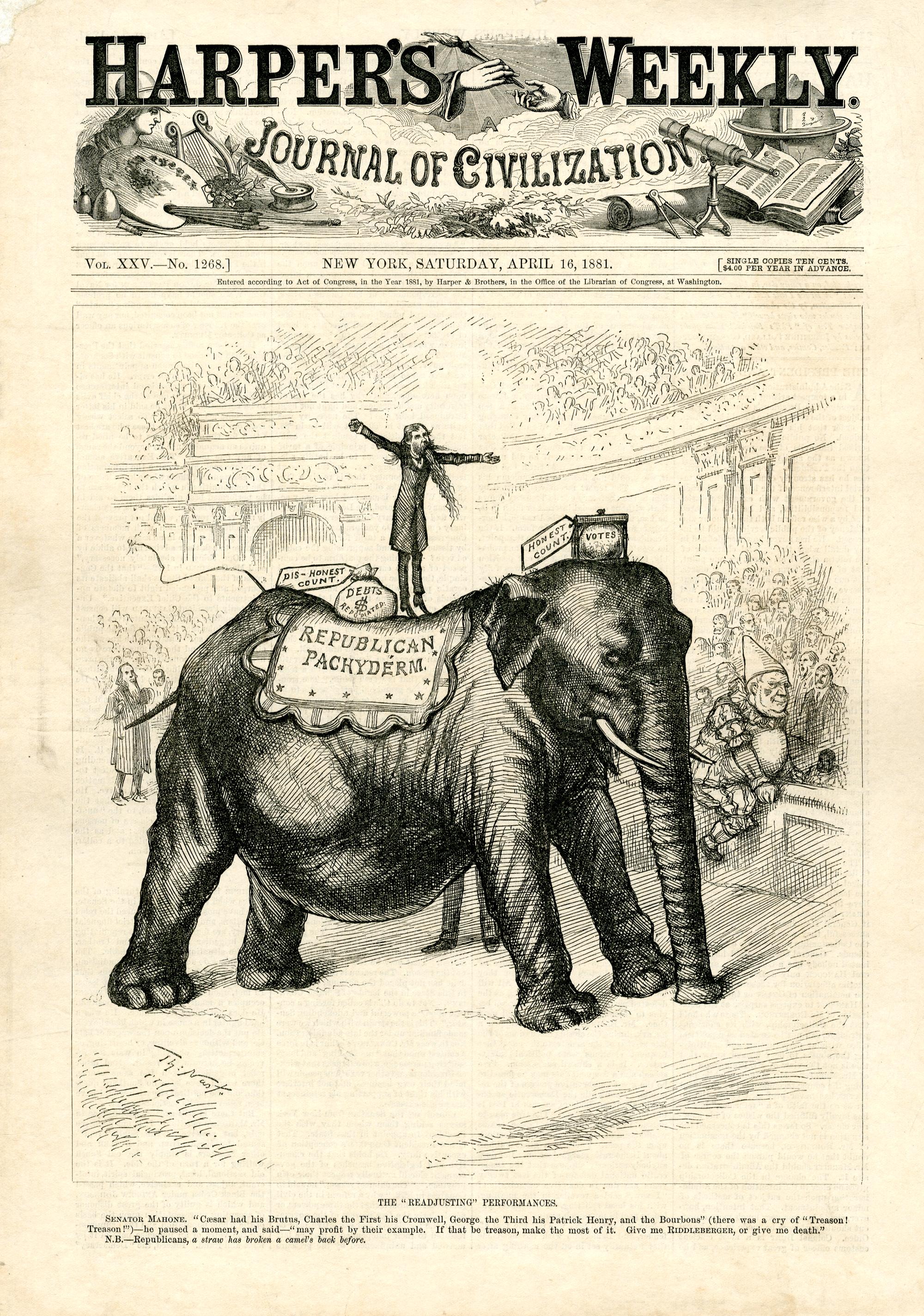 The "readjusting" performances. [Anschließend folgt ein Textblock] : Senator William Mahone balanciert in einer Zirkusarena auf dem Rücken des demokratischen Elefanten / Th. Nast