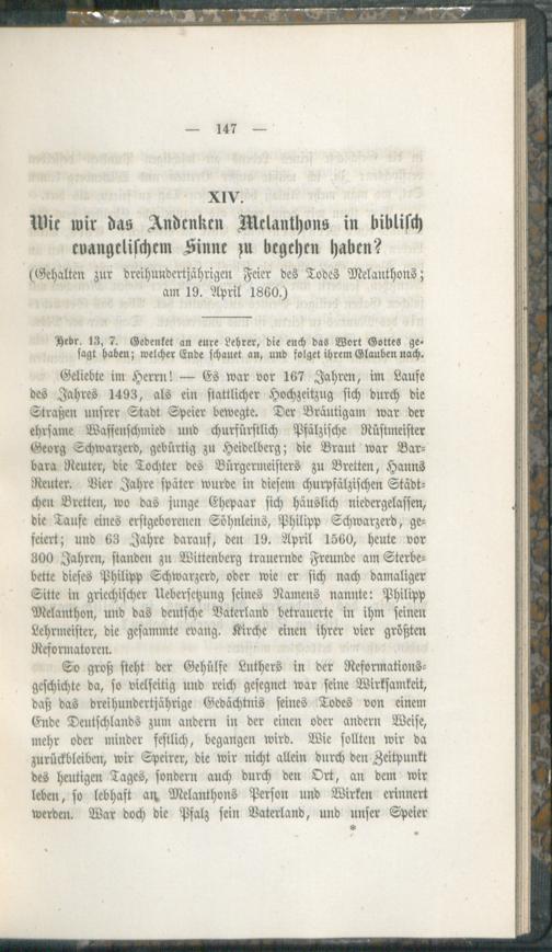 XIV. Wie wir das Andenken Melanthons in biblich evangelischem Sinne zu begehen haben? (Gehalten zur dreihunderjährigen Feier des Todes Melanthons; am 19. April 1860.)