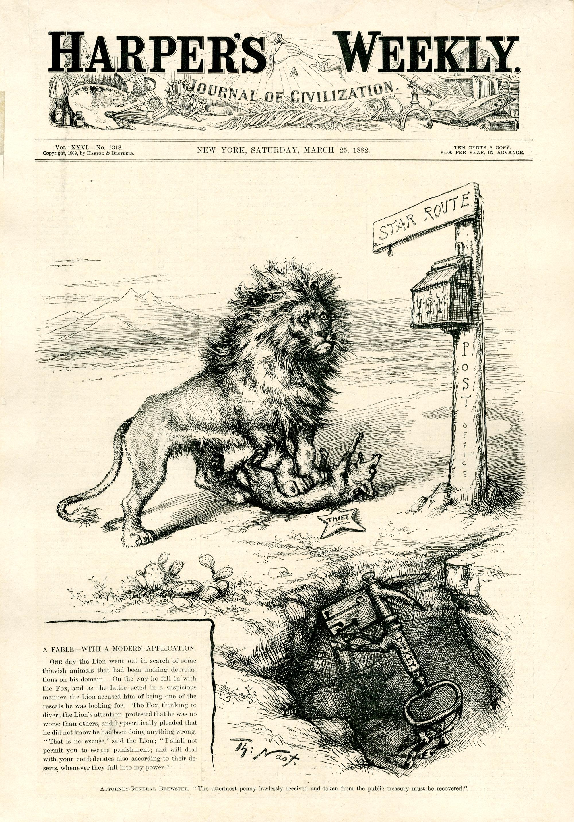 Attorney-General Brewster. "The uttermost penny lawlessly received and taken from the public treasury must be recovered." : Ein Löwe hat einen Fuchs besiegt, der einen Dieb symbolisiert. Ein Esel, der als Schlüssel dargestellt wird, schaut aus einer Grube heraus zu. In der Zeichnung befindet sich ein Textblock / Th. Nast