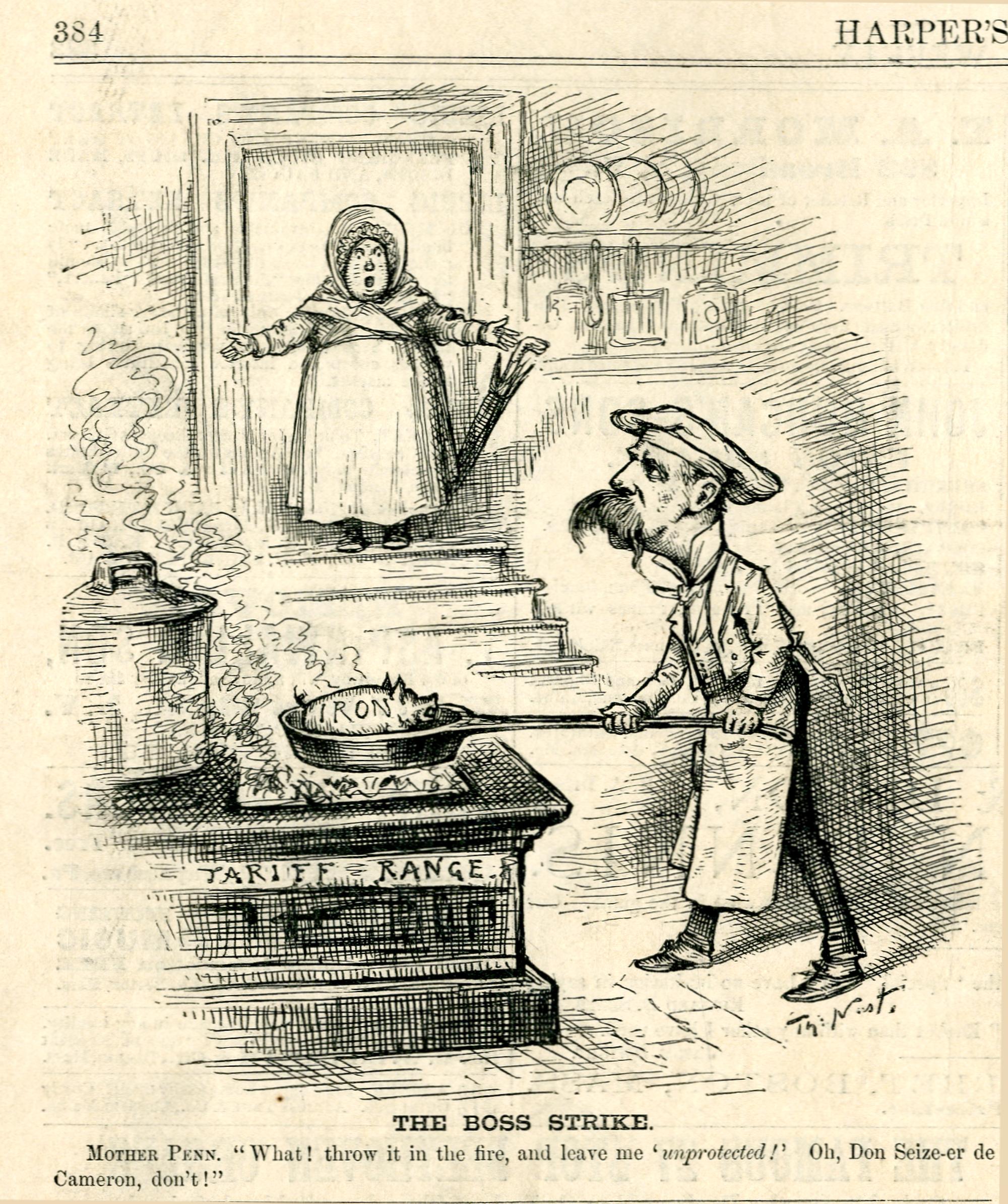 The boss strike. Mother Penn. "What! throw it in the fire, and leave me 'unprotected!' Oh, Don Seize-er de Cameron, don't!" : James Cameron brät ein Schwein, das die Eisenindustrie darstellt, auf einem Ofen, der die Preise symbolisiert / Th. Nast