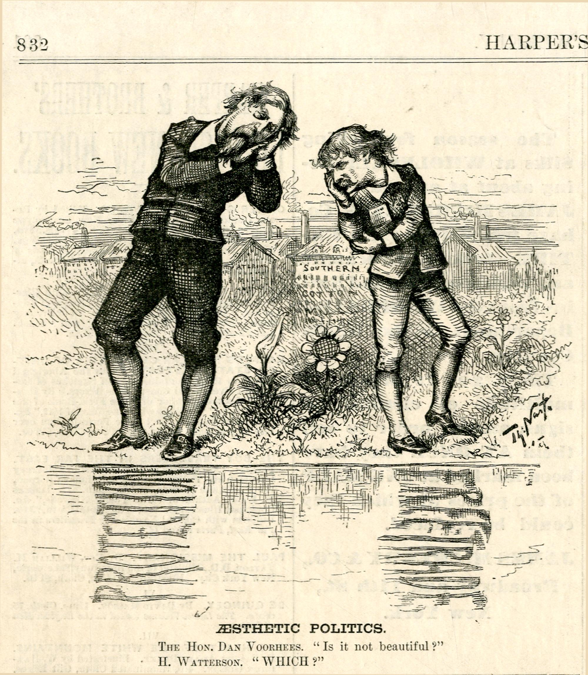 Aesthetic politics. The Hon. Dan Voorhees. Is it not beautiful? H. Watterson. Which? : Daniel Voorhees und Henry Watterson stehen am Ufer eines Sees. Im Wasser erscheinen die Begriffe Protection und Free Trade / Th. Nast