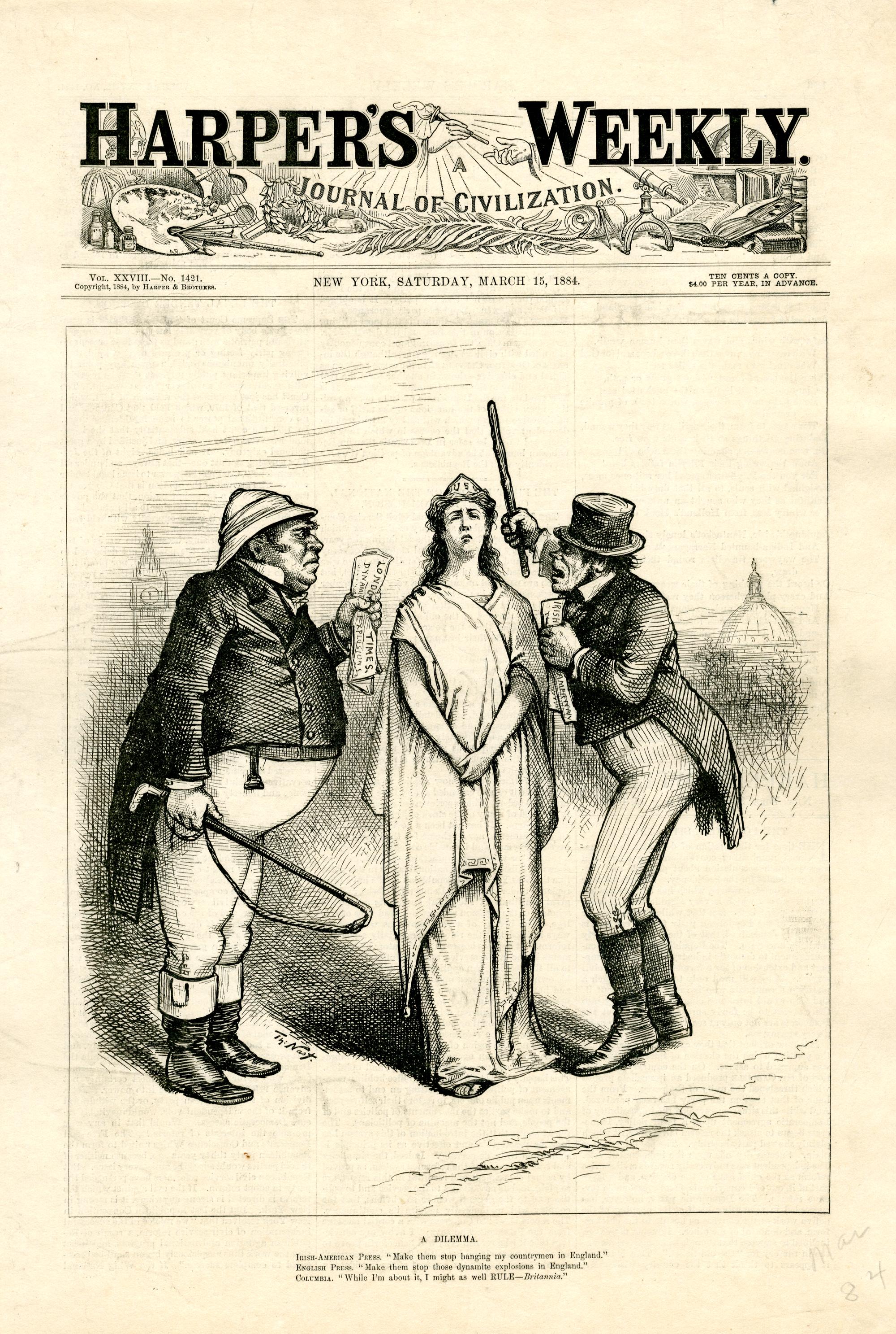 A dilemma. Irish-American press. "Make them stop hanging my countrymen in England." English press. "Make them stop those dynamite explosions in England." Columbia. "While I'm about it, I might as well rule - Britannia." : John Bull und ein irischer Einwanderer reden erregt auf Columbia ein / Th. Nast