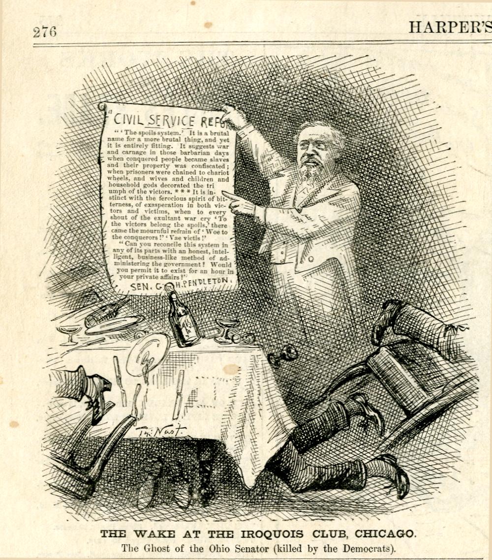 The wake at the Iroquois Club, Chicago. The Ghost of the Ohio Senator (killed by the Democrats) : der Geist von Senator Pendleton erscheint bei einem Bankett der Demokratischen Partei und zeigt eine Schrift mit seinen Thesen zur Civil Service Reform. [In der Zeichnung befindet sich ein Textblock] / Th. Nast