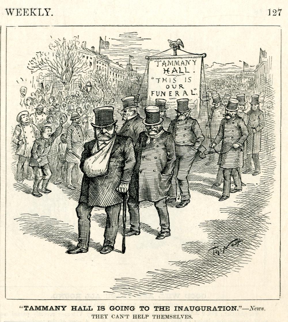 "Tammany Hall is going to the inauguration." - News. They can't help themselves : die Mitglieder der Tammany Hall veranstalten zur Amtseinführung Clevelands einen Umzug, der einer Trauerprozession gleicht / Th. Nast