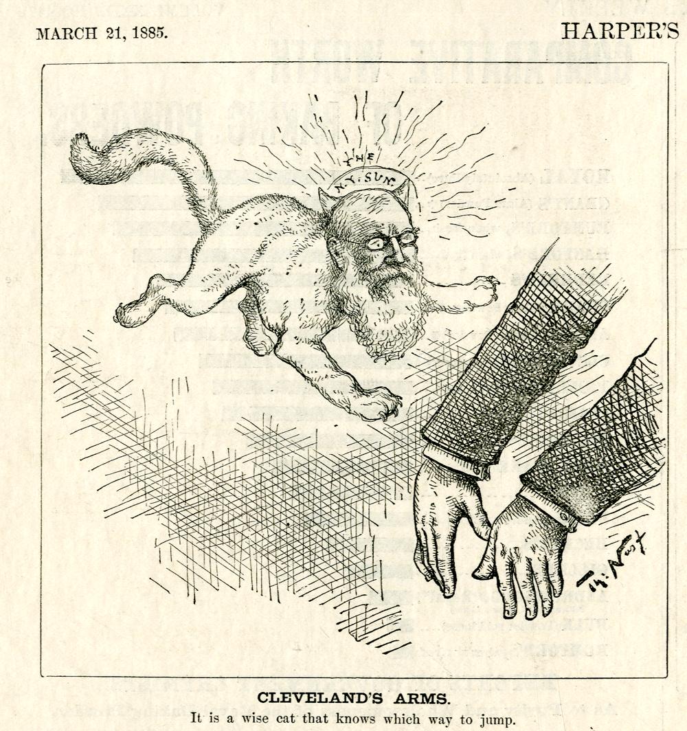 Cleveland's arms. It is a wise cat that knows which way to jump : Arunah Abell, der Herausgeber der Zeitung The Sun wird als Katze dargestellt, die in die Arme von Cleveland springt / Th. Nast