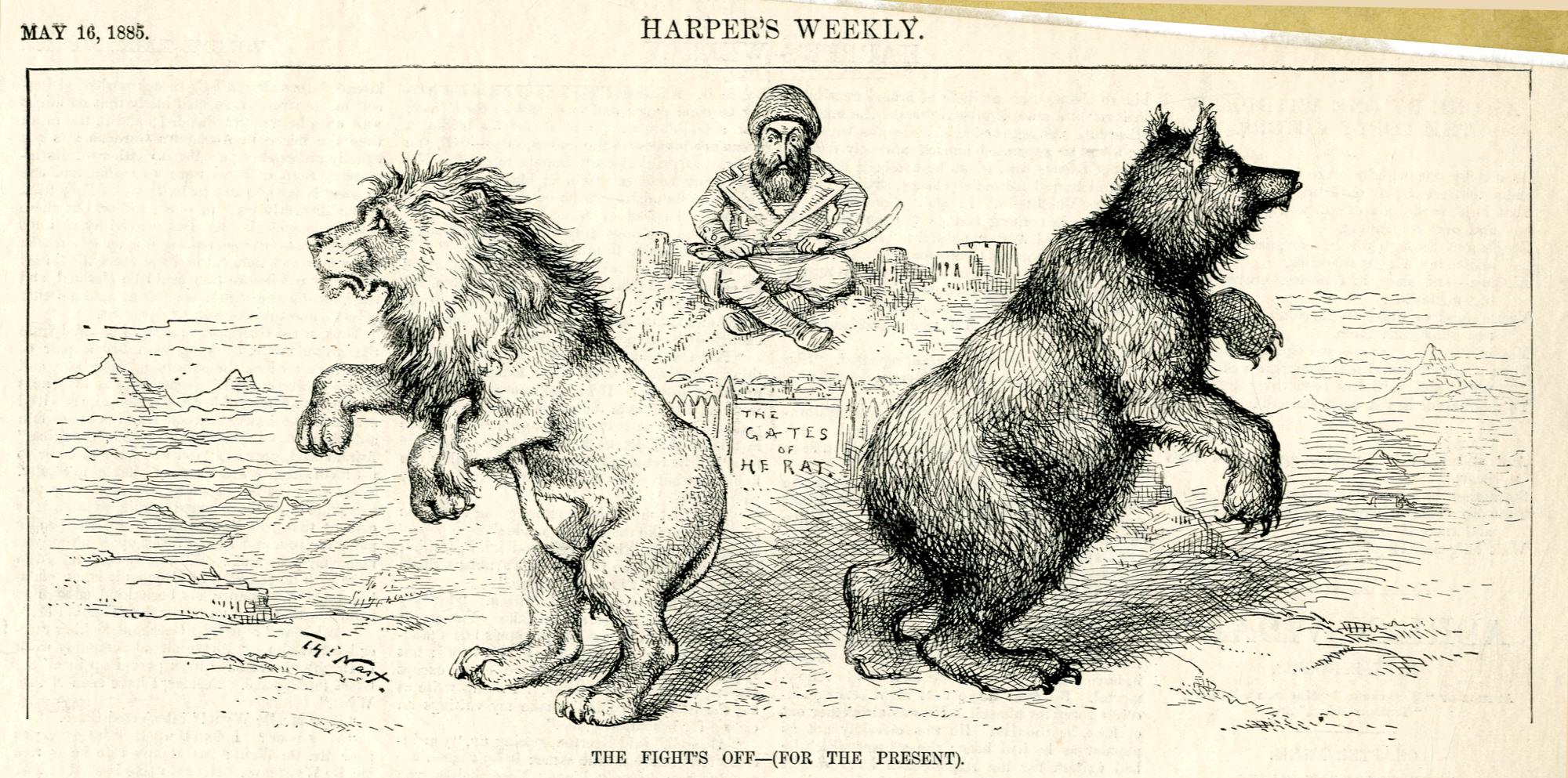 The fight's off - (for the present) : Abd ar Rahman, der Emir von Afghanistan, verweigert dem britischen Löwen und dem russischen Bären den Zutritt zu seinem Land / Th. Nast