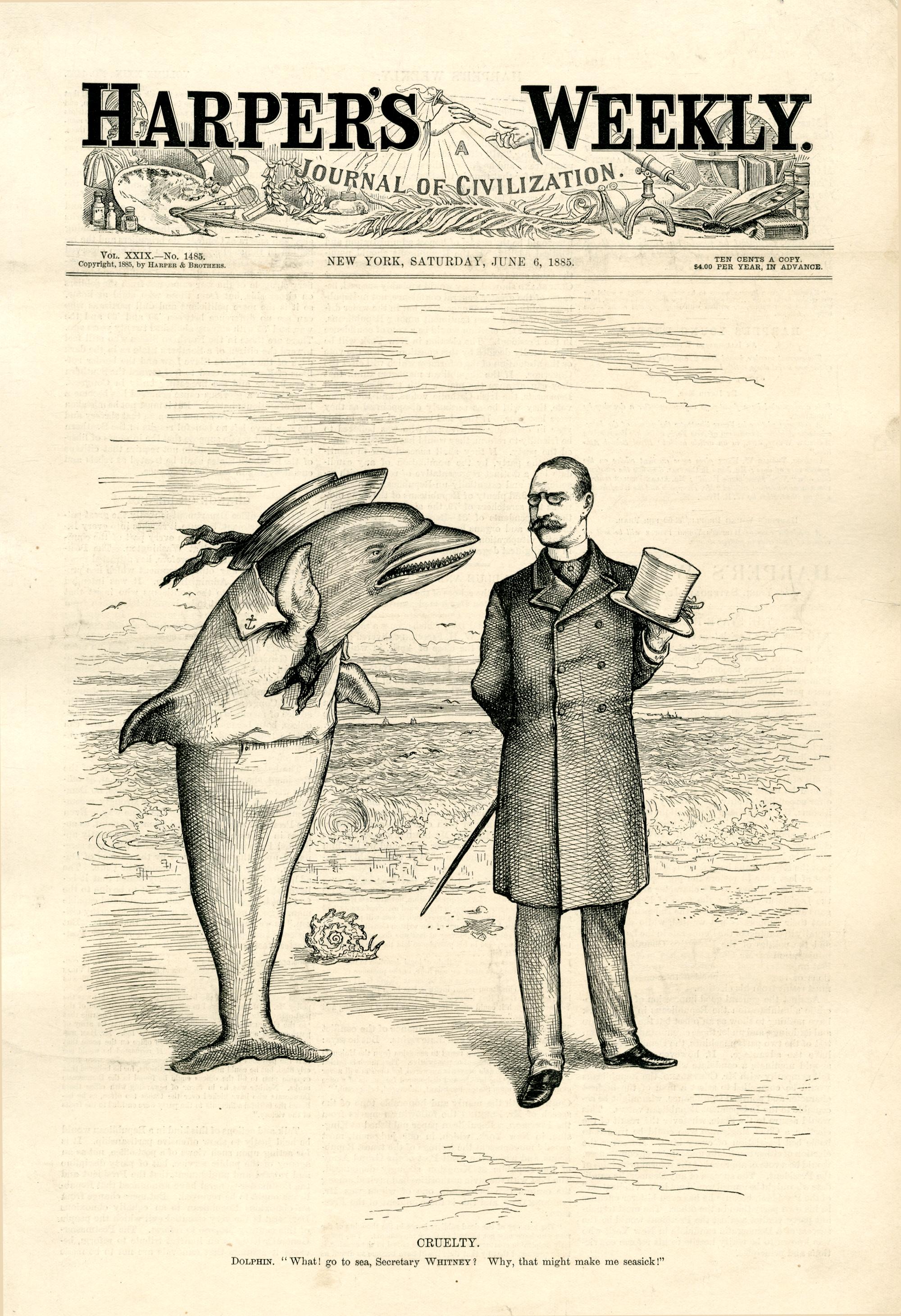Cruelty. Dolphin. "What! go to sea, Secretary Whitney? Why, that might make me seasick!" : Marineminister William Whitney steht an einem Strand und ein Delphin unterhält sich mit ihm / [Thomas Nast]