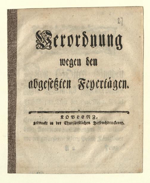 Verordnung wegen den abgesetzten Feyertägen / [Clemens Wenceslaus Churfürst]