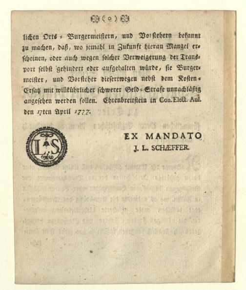 Generale Transport der Arrestanten und die darzu durch die Aemter zu leitenden Fuhren, und Nachen betreffend : vom 17ten April 1777 / [Klemens Wenzeslaus, Kurfürst von Trier. Ex Mandato J. L. Schaeffer]