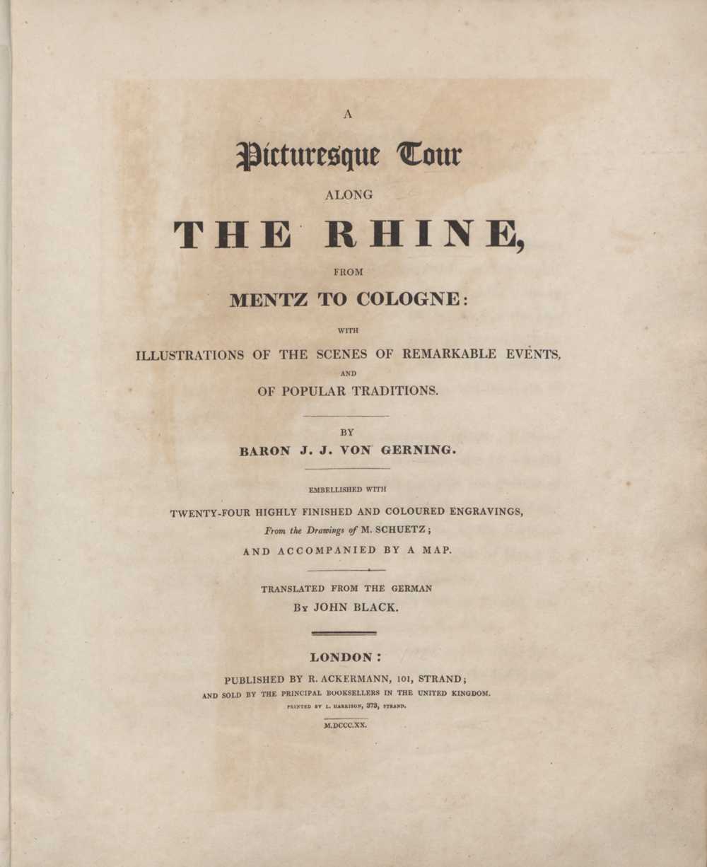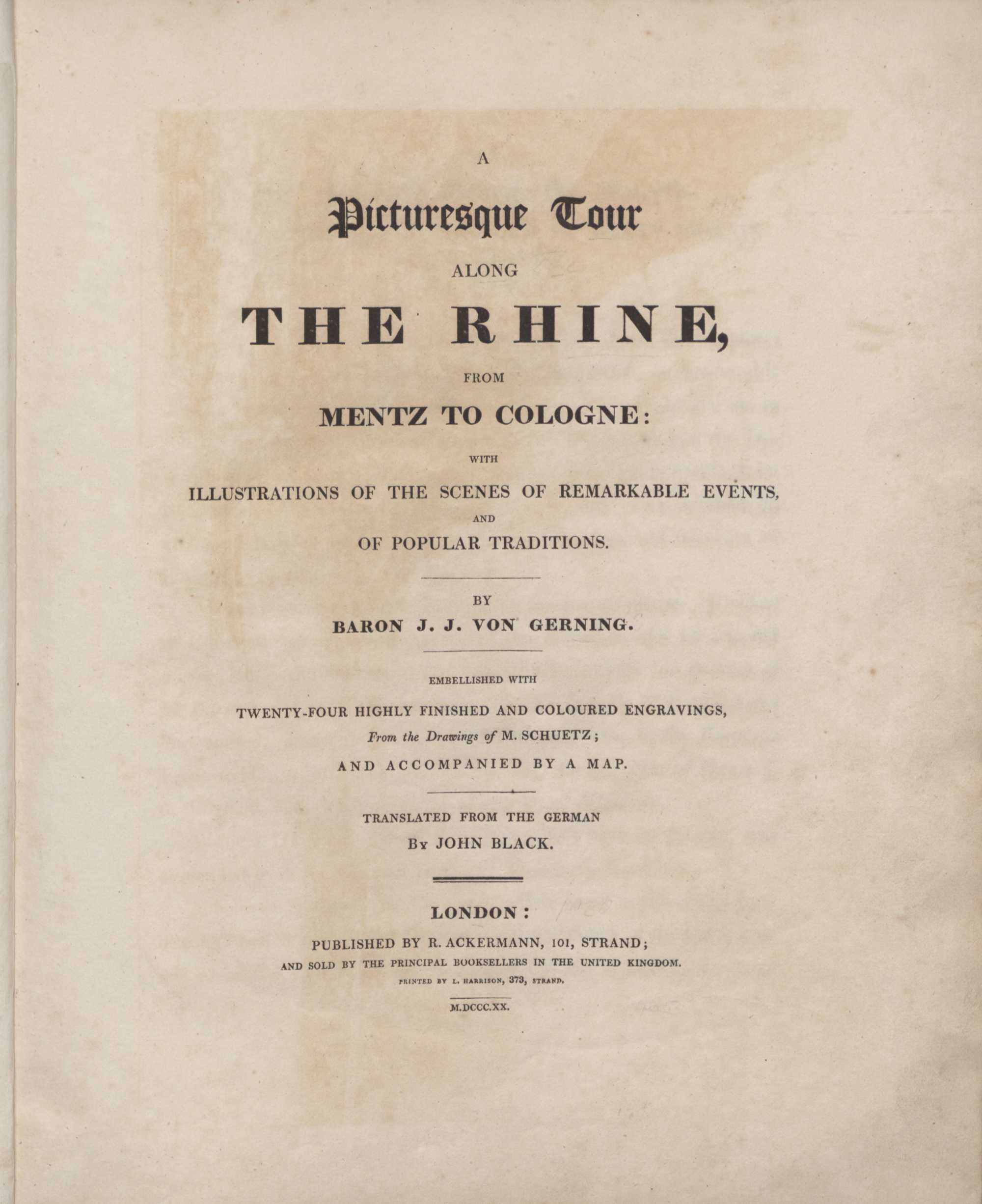 A picturesque tour along the Rhine from Mentz to Cologne : with illustrations of the scenes of remarkable events, and of popular traditions / by J. J. von Gerning. Embellished with twenty-four highly finished and coloured engravings, from the drawings of M. Schuetz ... Translated from the German by John Black