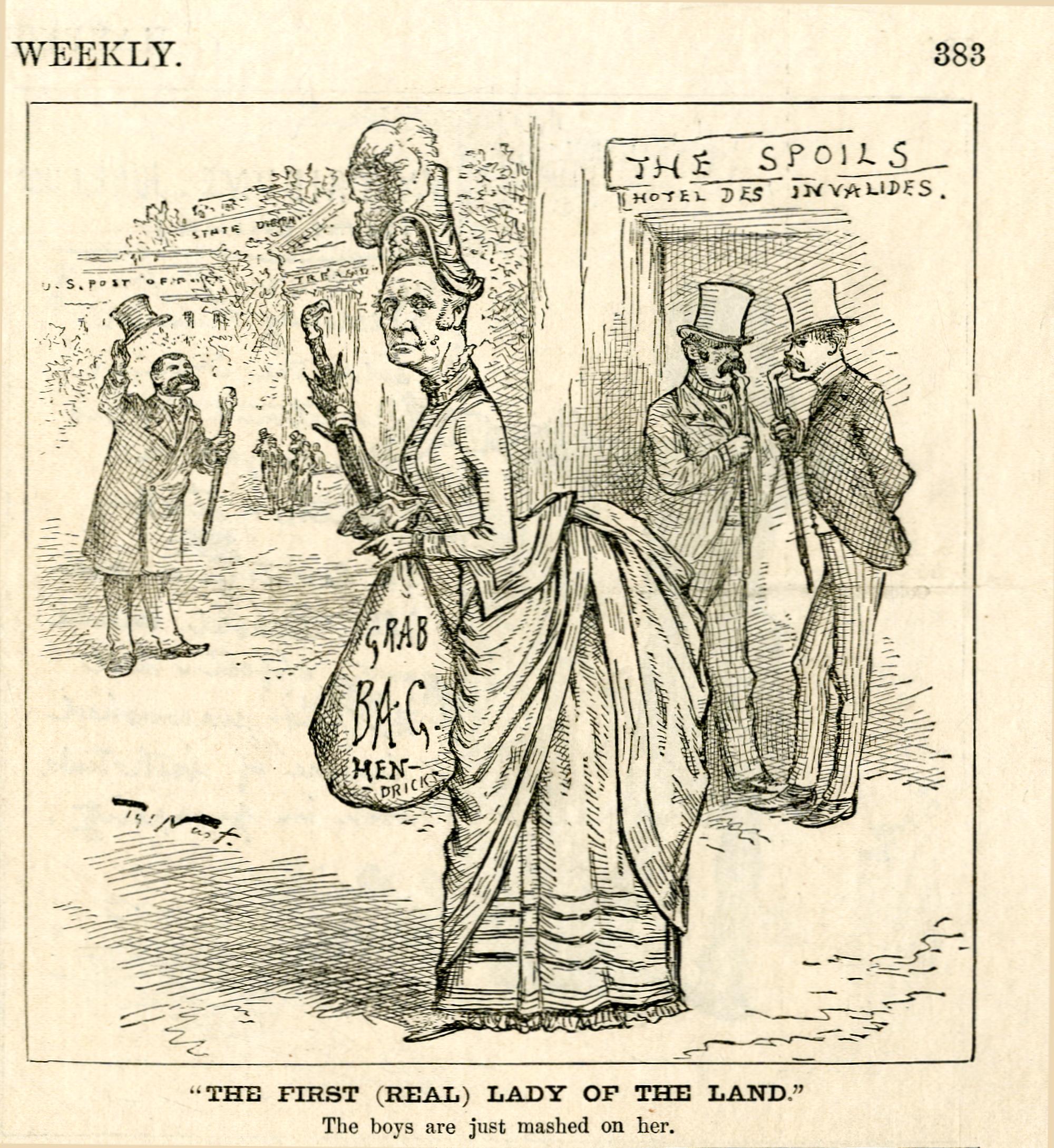 "<<The>> First (real) Lady of the Land. The boys are just mashed on her." : Vizepräsident Thomas Hendricks wird als eine Dame dargestellt, die von den Männern bewundert wird / Th. Nast