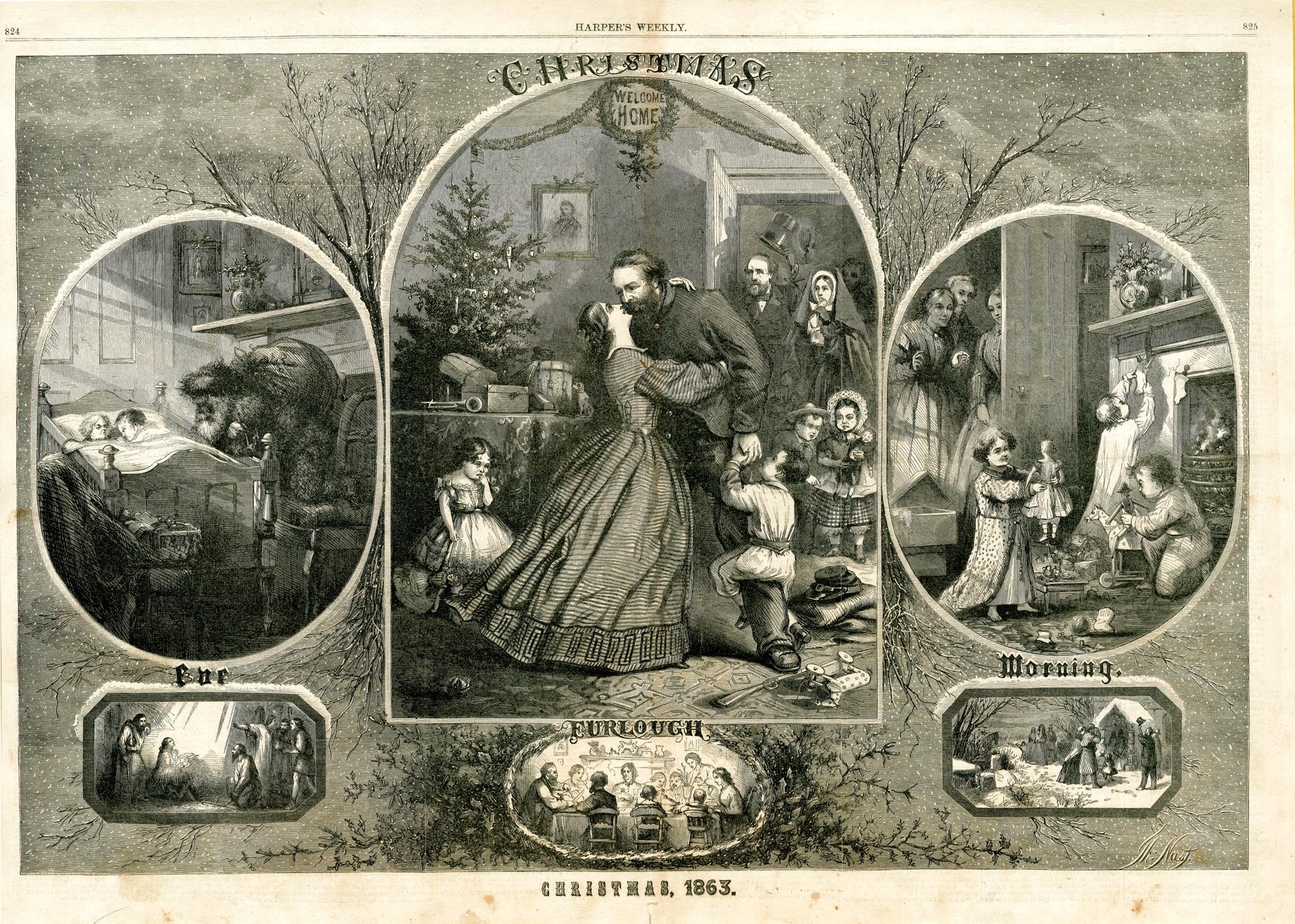 Christmas, 1863 : die Zeichnung besteht aus 6 Bildern, von denen eines beschrieben wird: Ein Soldat kehrt an Weihnachten aus dem Krieg zu seiner Familie heim. Text: Furlough / Th. Nast