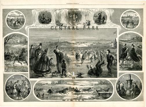 Central Park in Winter : die Zeichnung besteht aus 11 Bildern, die in der Reihenfolge von links oben nach rechts unten beschrieben werden: Inschrift der Zeichnung: Central Park in Winter. 1) Schlittschuhläufer auf einem zugefrorenen See. Text: Sketch on the Large Pond. 2) Ein Mann ist einer Frau beim Anziehen der Schlittschuhe behilflich. Text: Getting ready. 3) Symbolische Darstellung des Winters. Text: Jack Frost. The ball is up. 4) Ein Paar läuft auf Schlittschuhen läuft. Text: Put your skates on Mister. 5) Schlittschuhläufer auf einem See. Text: New York Skating Club. 6) Pferdeschlitten fahren durch den Schnee. 7) Schlittschuhläufer auf einem zugefrorenen See. 8) Ein Paar reitet durch eine Winterlandschaft. 9) Mehrere Personen stehen an einem Imbißstand. Text: Refreshments. 10) Schlitten fahren durch eine Winterlandschaft. 11) Schlittschuhläufer drängen sich um einen Ofen. Text: Warming up / Th. Nast