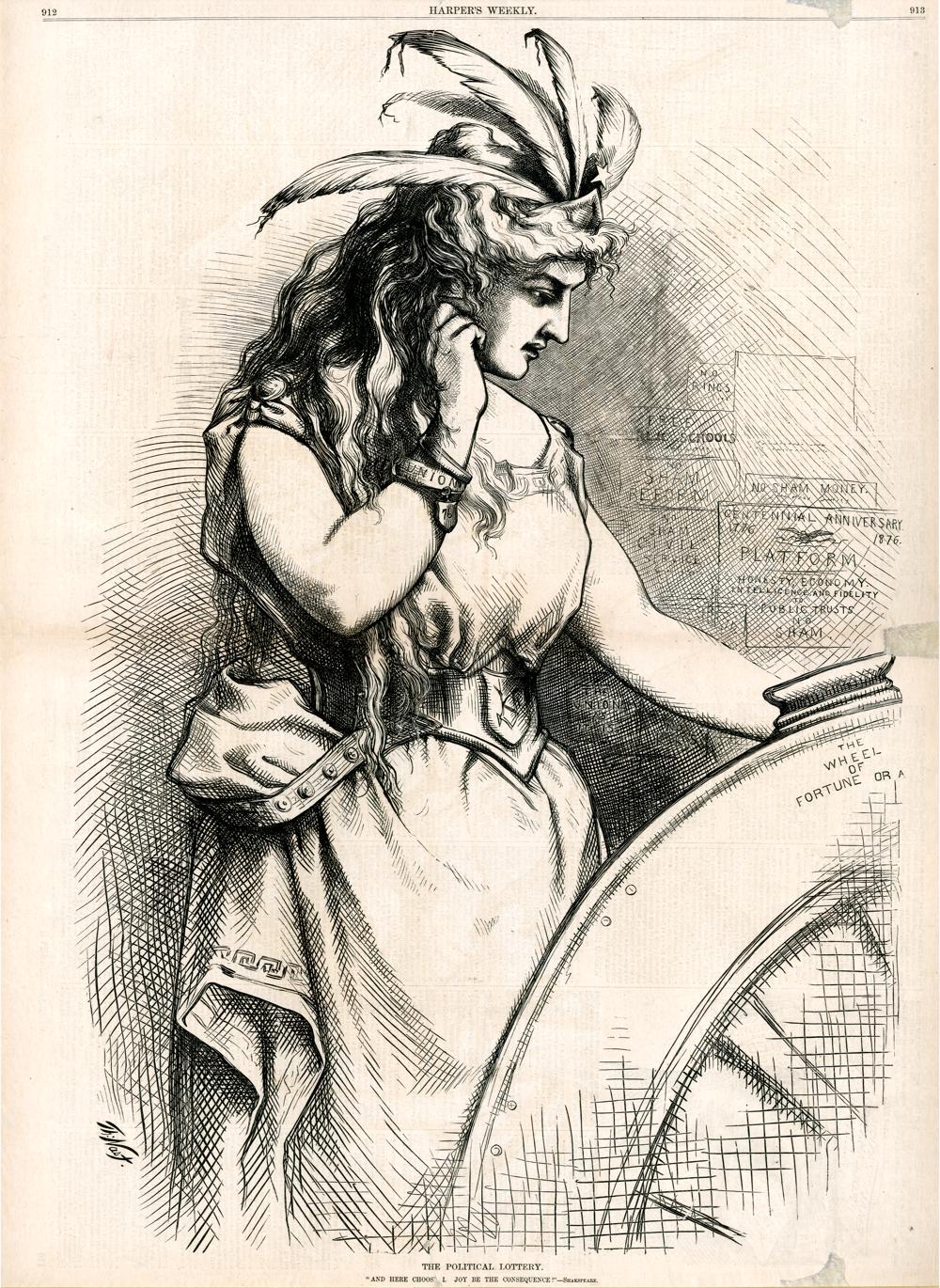 The political lottery. "And here choose I. Joy be the consequence!" - Shakespeare : Columbia dreht das Glücksrad eines Lotteriespiels / Th. Nast