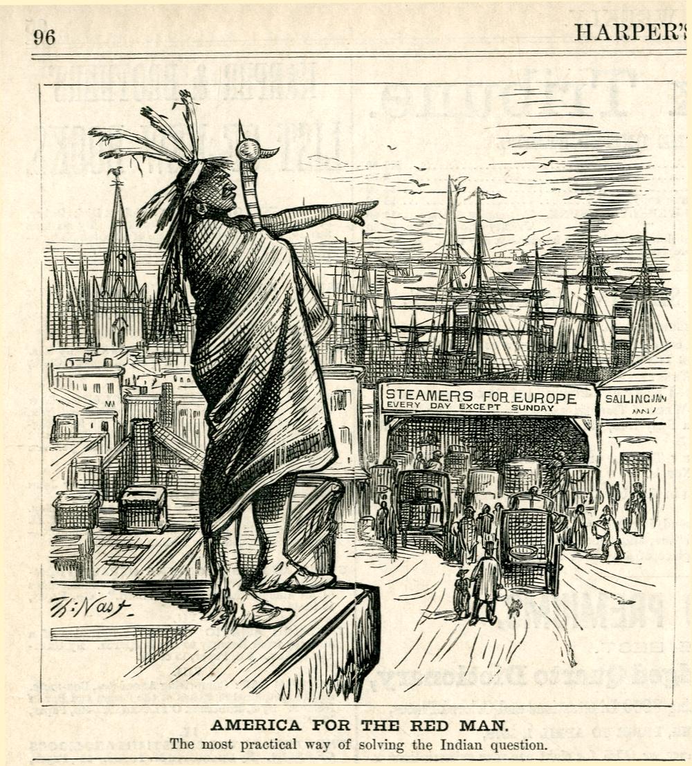 America for the Red Man. The most practical way of solving the Indian question : ein Indianer weist alle Weißen aus Amerika aus, damit sie nach Europa zurückkehren / Th. Nast