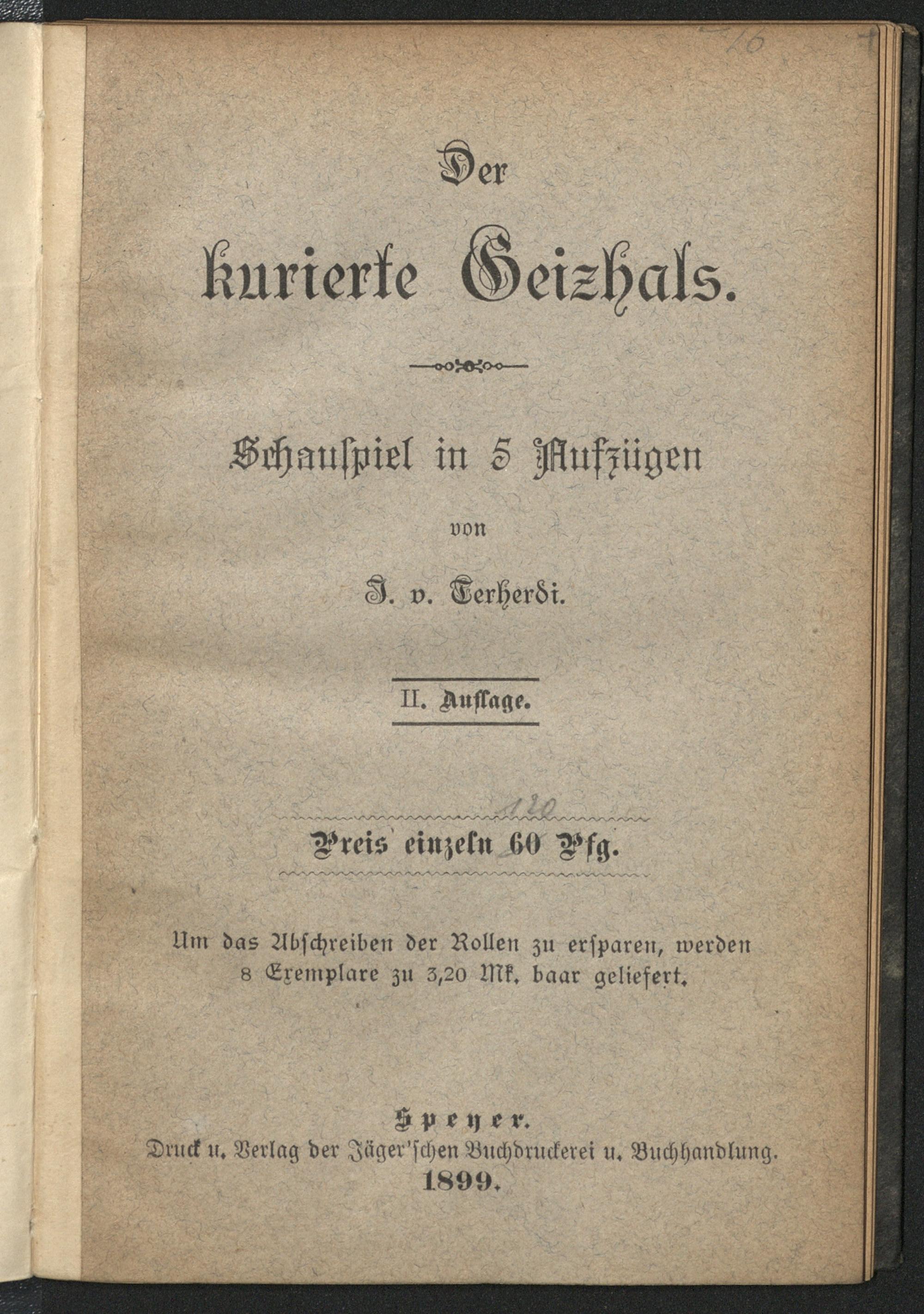 Der kurierte Geizhals : Schauspiel in 5. Aufz / von J. v. Therherdi