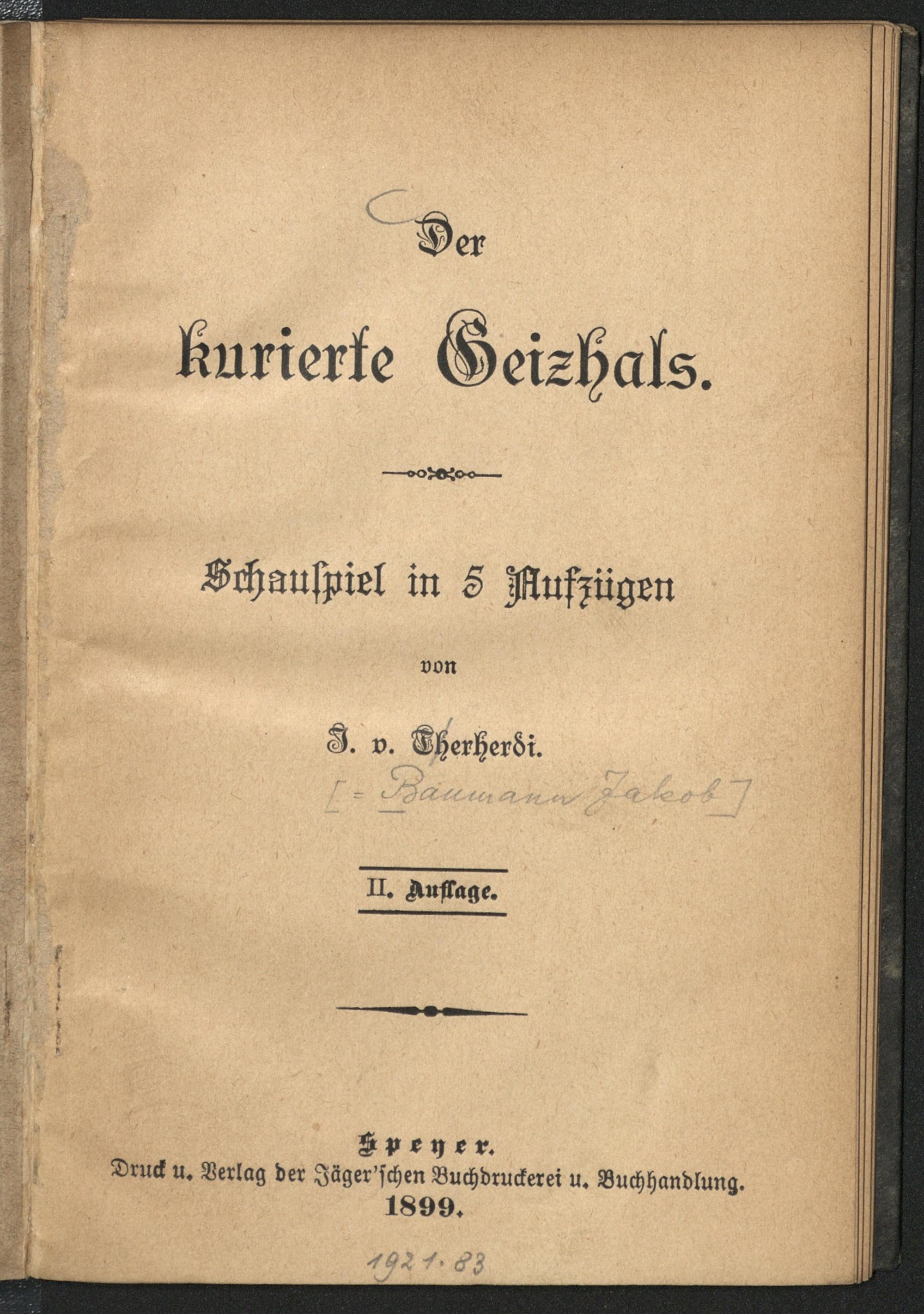 Der kurierte Geizhals : Schauspiel in 5. Aufz / von J. v. Therherdi