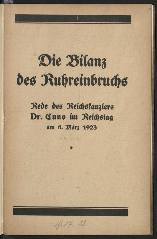 Die Bilanz des Ruhreinbruchs : Rede des Reichskanzlers Dr. Cuno im Reichstag am 6. März 1923