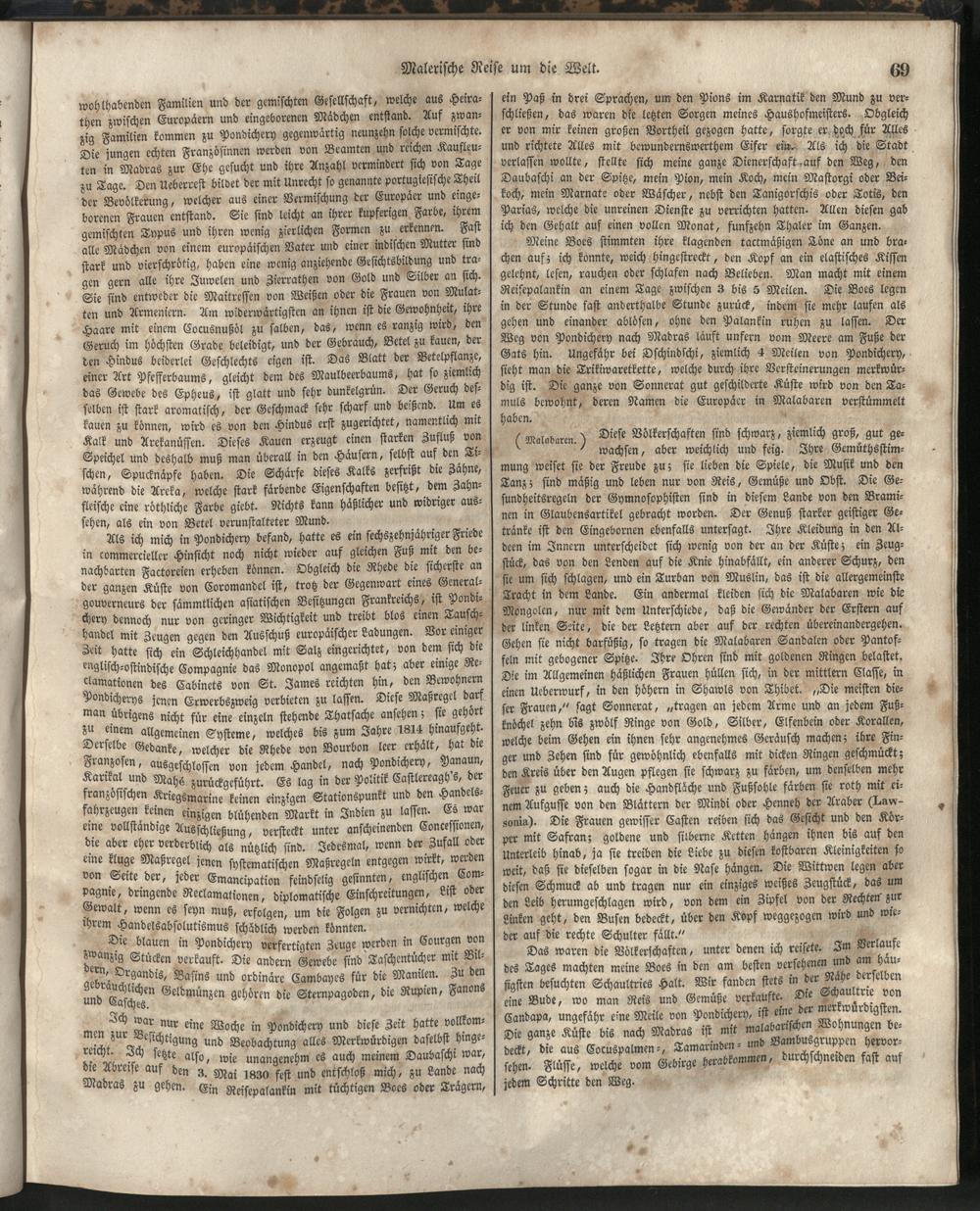 1 (1835) Malerische Reise um die Welt : Eine geordnete Zusammenstellung des Wissenswerthesten von den Entdeckungsreisen eines Magellan, Tasman, Dampier, Anson, Byron, Wallis, Carteret, Bougainville, Cook, Laperouse, Bligh, ... ; Mit Karten und 500 Abbildungen / verfaßt von einer Gesellschaft Reisender und Gelehrter unter der Leitung des Herrn Dümont d'Urville. In's Deutsche übertragen und mit einigen Anmerkungen und Zusätzen versehen von Dr. A. Diezmann