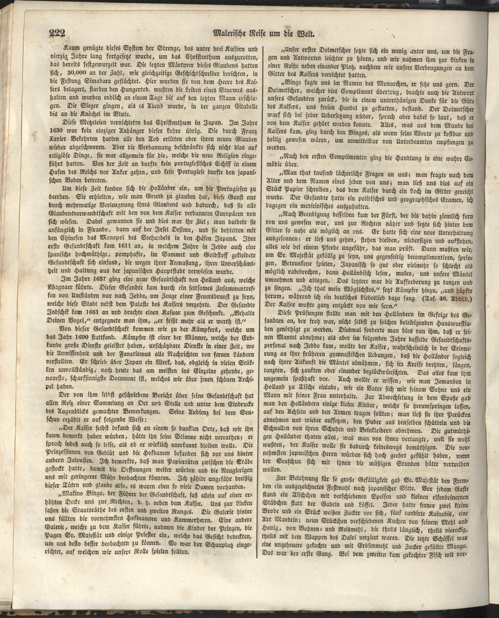 1 (1835) Malerische Reise um die Welt : Eine geordnete Zusammenstellung des Wissenswerthesten von den Entdeckungsreisen eines Magellan, Tasman, Dampier, Anson, Byron, Wallis, Carteret, Bougainville, Cook, Laperouse, Bligh, ... ; Mit Karten und 500 Abbildungen / verfaßt von einer Gesellschaft Reisender und Gelehrter unter der Leitung des Herrn Dümont d'Urville. In's Deutsche übertragen und mit einigen Anmerkungen und Zusätzen versehen von Dr. A. Diezmann