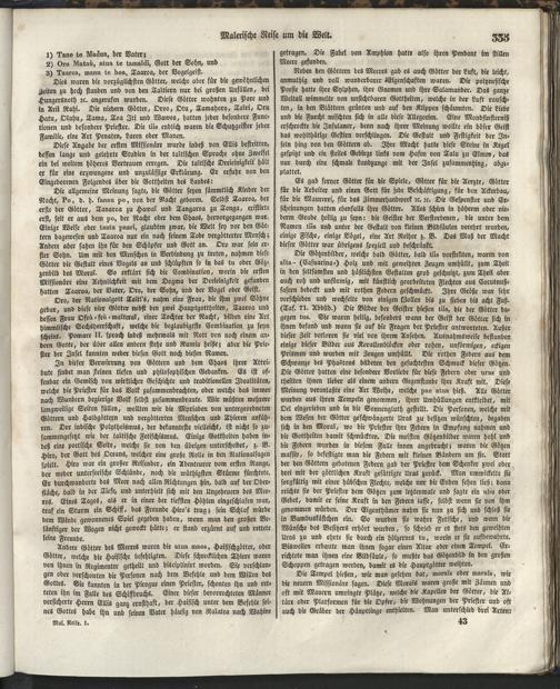 1 (1835) Malerische Reise um die Welt : Eine geordnete Zusammenstellung des Wissenswerthesten von den Entdeckungsreisen eines Magellan, Tasman, Dampier, Anson, Byron, Wallis, Carteret, Bougainville, Cook, Laperouse, Bligh, ... ; Mit Karten und 500 Abbildungen / verfaßt von einer Gesellschaft Reisender und Gelehrter unter der Leitung des Herrn Dümont d'Urville. In's Deutsche übertragen und mit einigen Anmerkungen und Zusätzen versehen von Dr. A. Diezmann