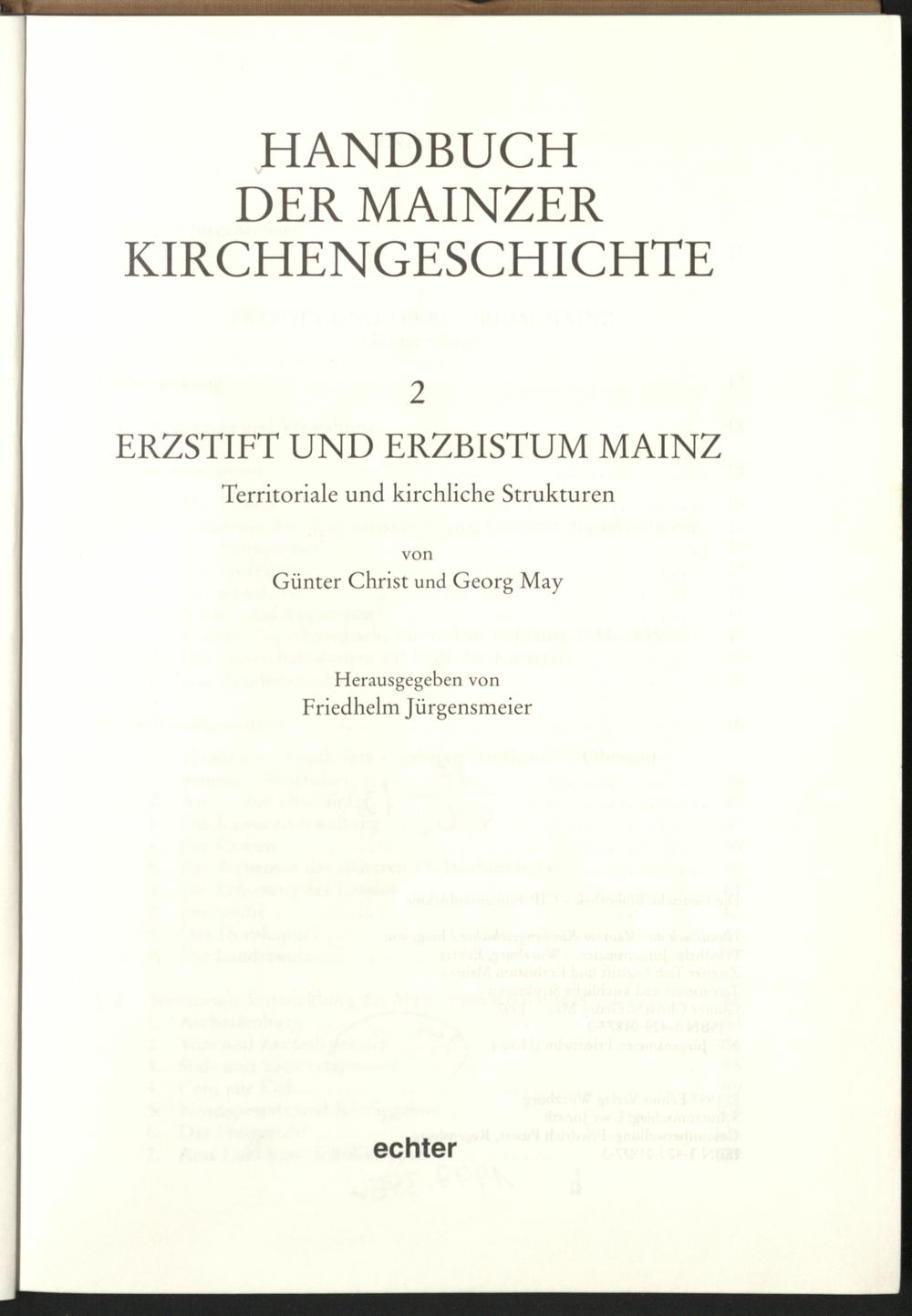 2 (1997) Erzstift und Erzbistum Mainz : territoriale und kirchliche Strukturen / von Günter Christ ... / hrsg. von Friedhelm Jürgensmeier