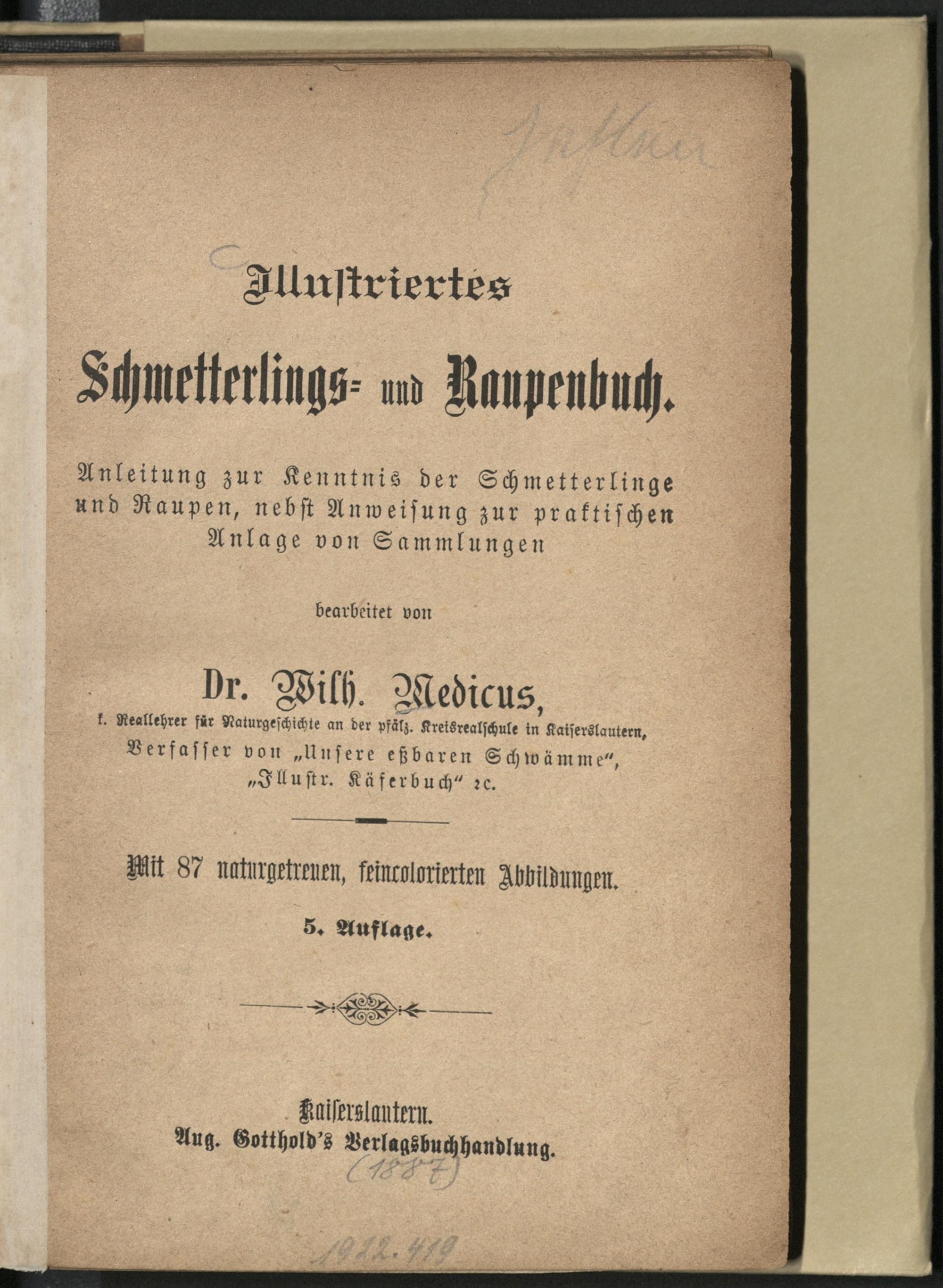 Illustriertes Schmetterlings- und Raupenbuch : Anleitung zur Kenntnis der Schmetterlinge und Raupen, nebst Anweisung zur praktischen Anlage von Sammlungen / bearb. von Wilh. Medicus