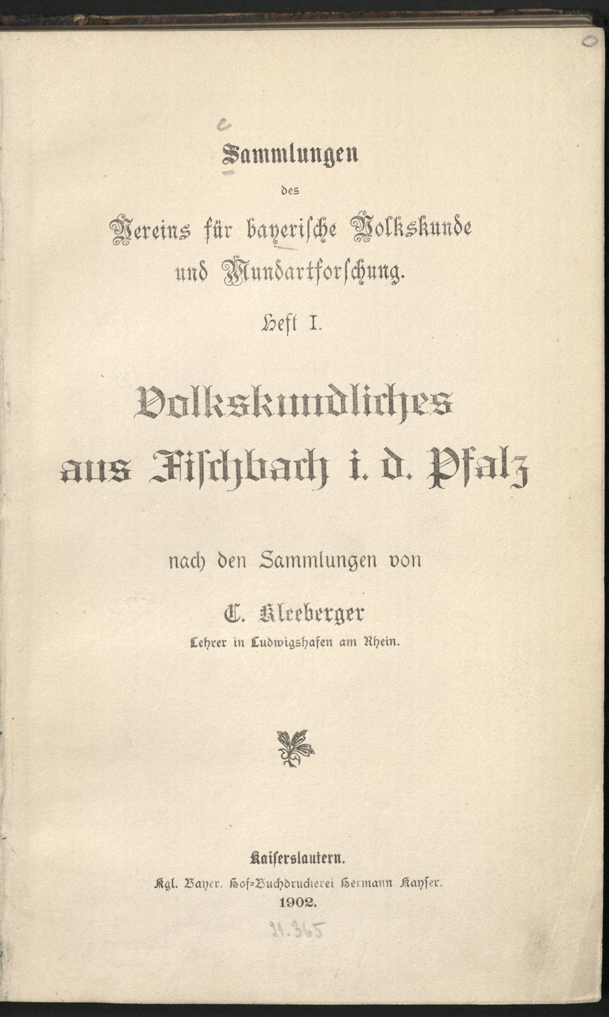 Volkskundliches aus Fischbach i. d. Pfalz / nach den Samml. von C. Kleeberger