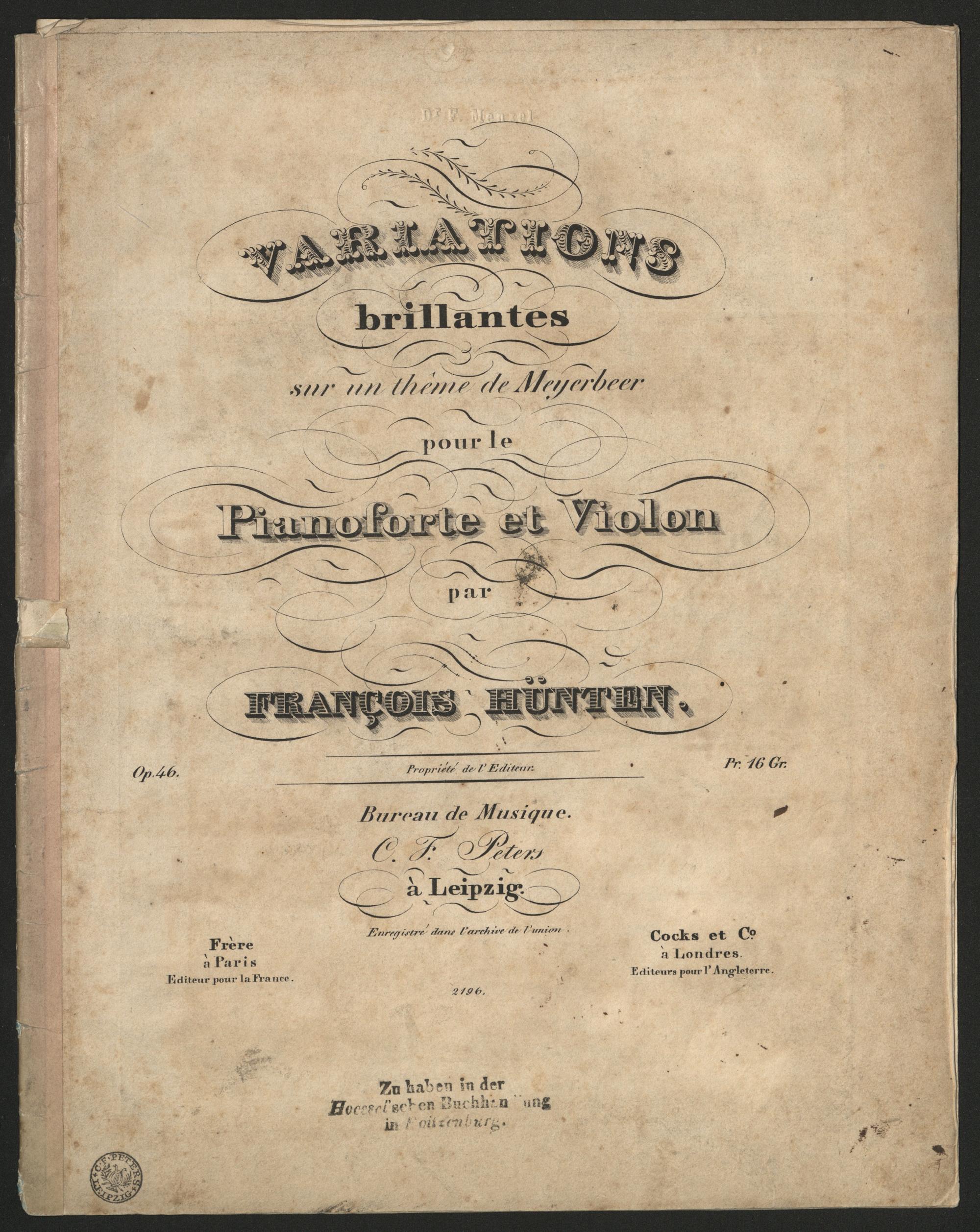 Variations brillantes pour le piano sur un thême de Meyerbeer pour le pianoforte et le violon : op. 46 / par François Hünten
