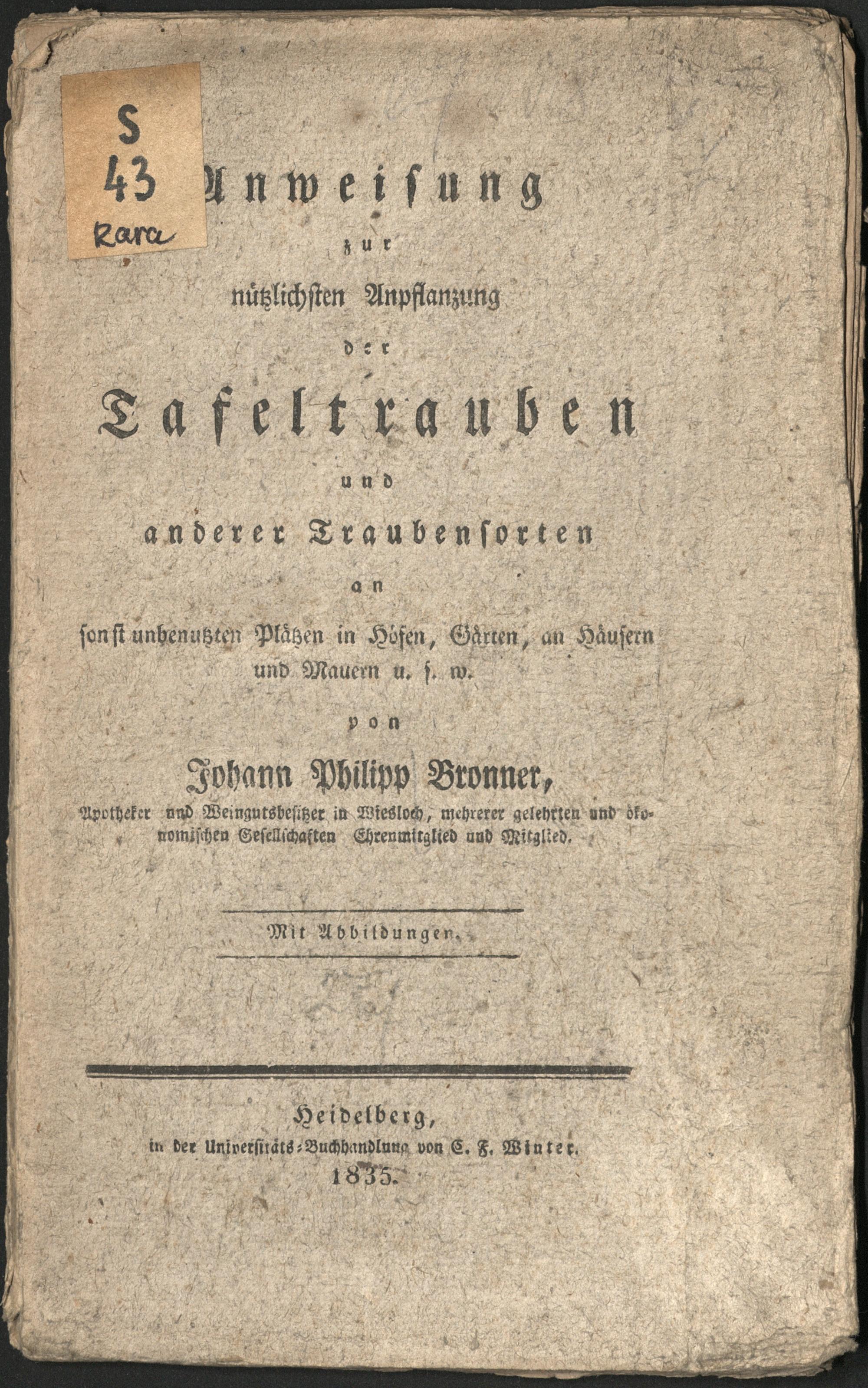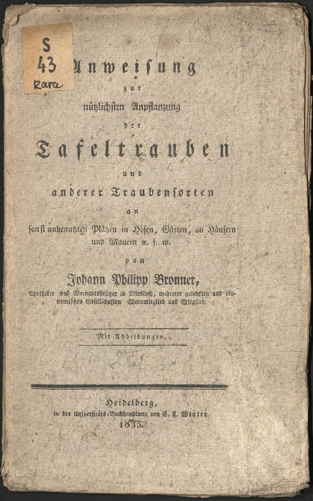 Anweisung zur nützlichsten Anpflanzung der Tafeltrauben und anderer Traubensorten an sonst unbenutzten Plätzen in Höfen, Gärten, an Häusern und Mauern u.s.w : Mit Abbildungen / von Johann Philipp Bronner