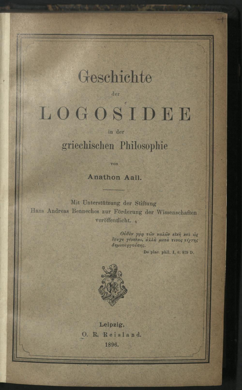 1 (1896) Geschichte der Logosidee in der griechischen Philosophie / von Anathon Aall