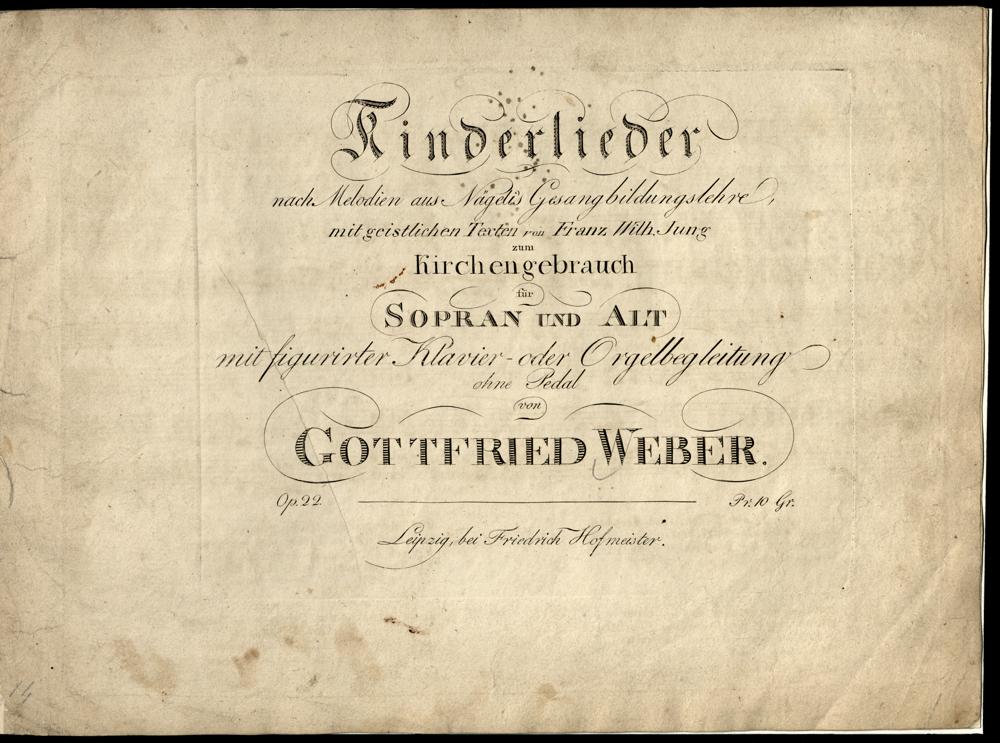 Kinderlieder : nach Melodien aus Nägelis Gesangbildungslehre ; zum Kirchengebrauch für Sopran und Alt mit figurirter Klavier- oder Orgelbegleitung ohne Pedal ; op. 22 / von Gottfried Weber. Mit geistl. Texten von Franz Wilh. Jung