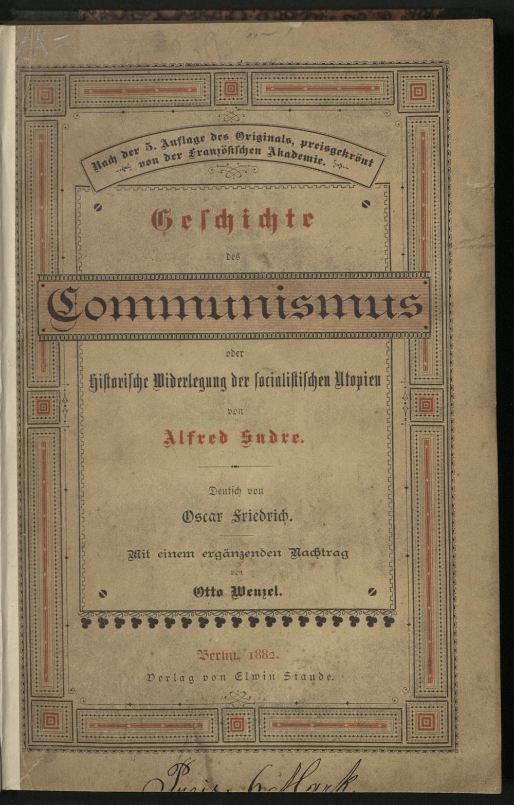 Geschichte des Communismus oder Historische Wiederlegung der sozialistischen Utopien / Alfred Sudre. Mit e. erg. Nachtr. v. Otto Wenzel