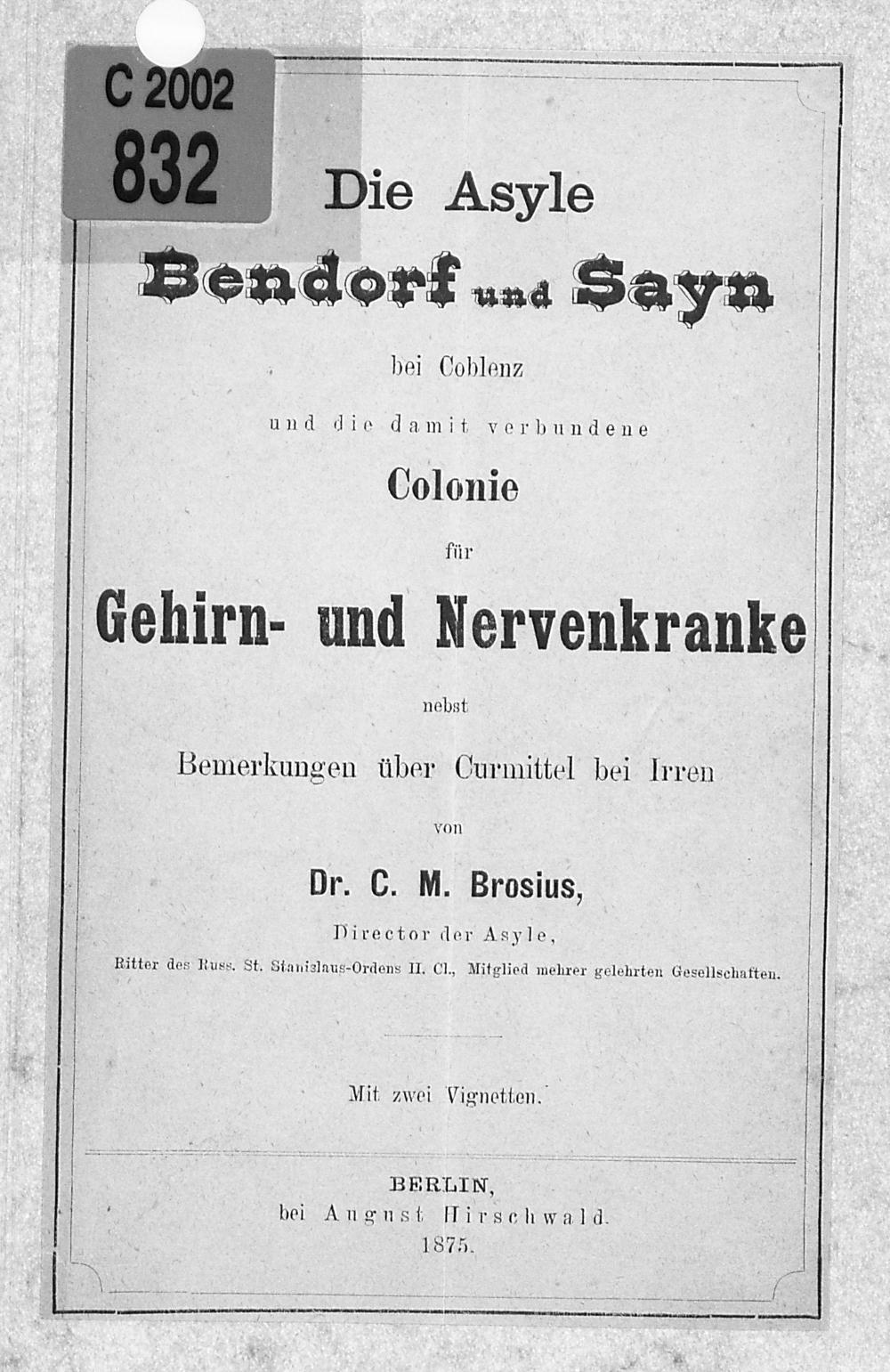 Die Asyle Bendorf und Sayn bei Coblenz und die damit verbundene Colonie für Gehirn- und Nervenkranke : nebst Bemerkungen über Curmittel bei Irren / von C. M. Brosius