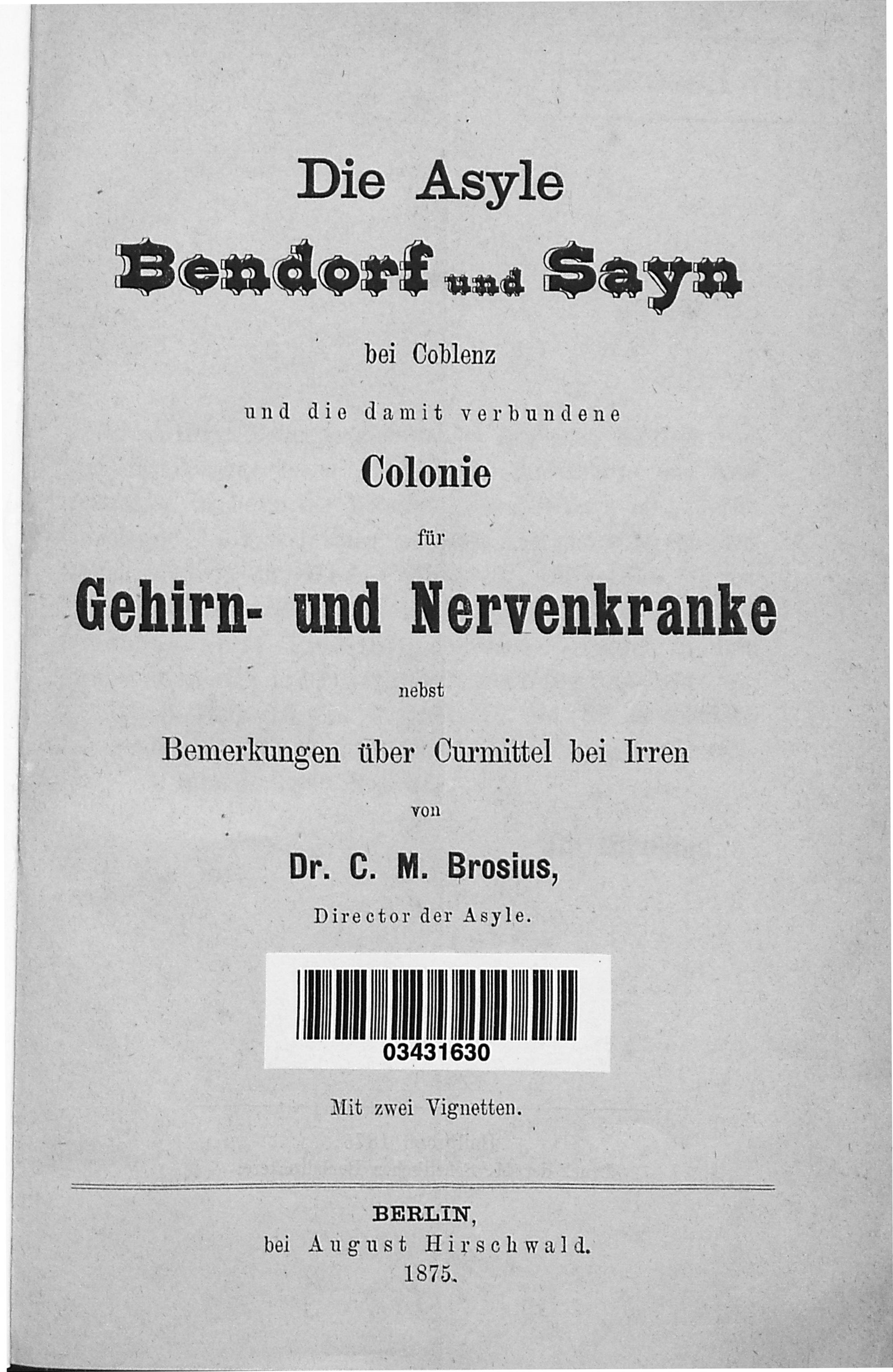 Die Asyle Bendorf und Sayn bei Coblenz und die damit verbundene Colonie für Gehirn- und Nervenkranke : nebst Bemerkungen über Curmittel bei Irren / von C. M. Brosius