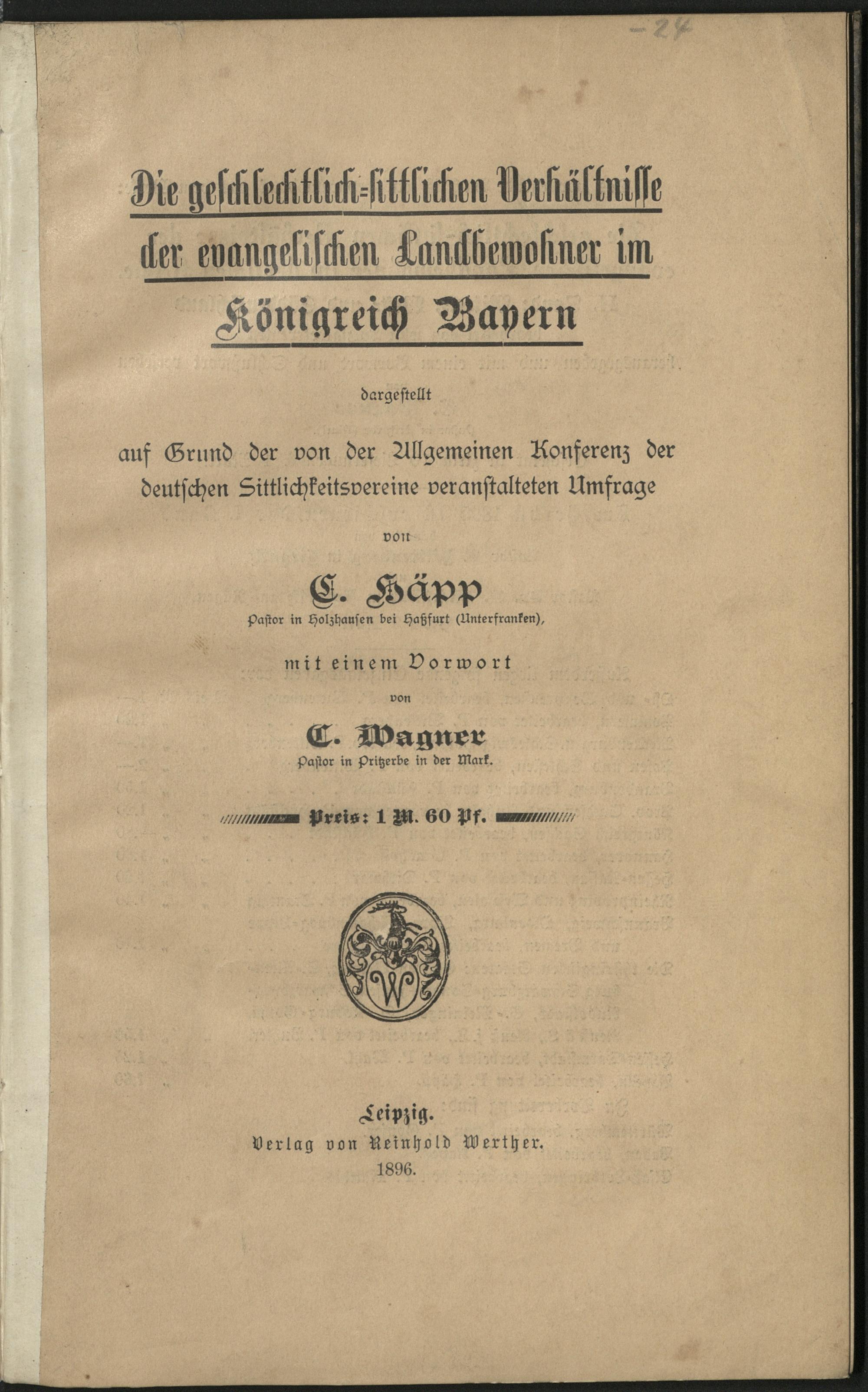 Die geschlechtlich-sittlichen Verhältnisse der evangelischen Landbewohner im Königreich Bayern / berbeitet von C. Häpp. Dargestellt auf Grund der von der Allgemeinen Konferenz der deutschen Sittlichkeitsvereine veanstalteten Umfrage. Mit einem Vorwort von C. Wagner
