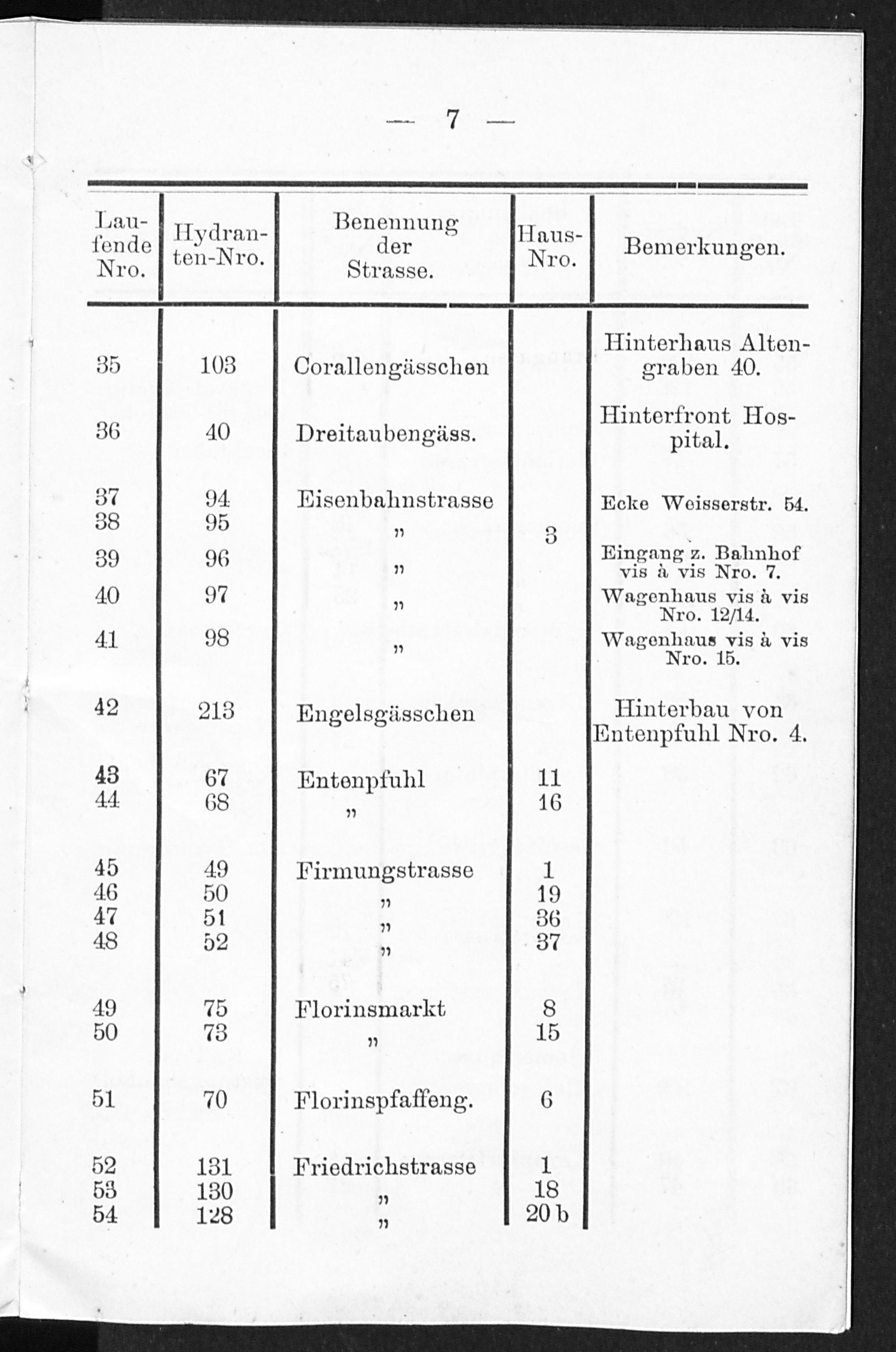 Verzeichniss der zur städtischen Wasserleitung in Coblenz gehörigen Hydranten