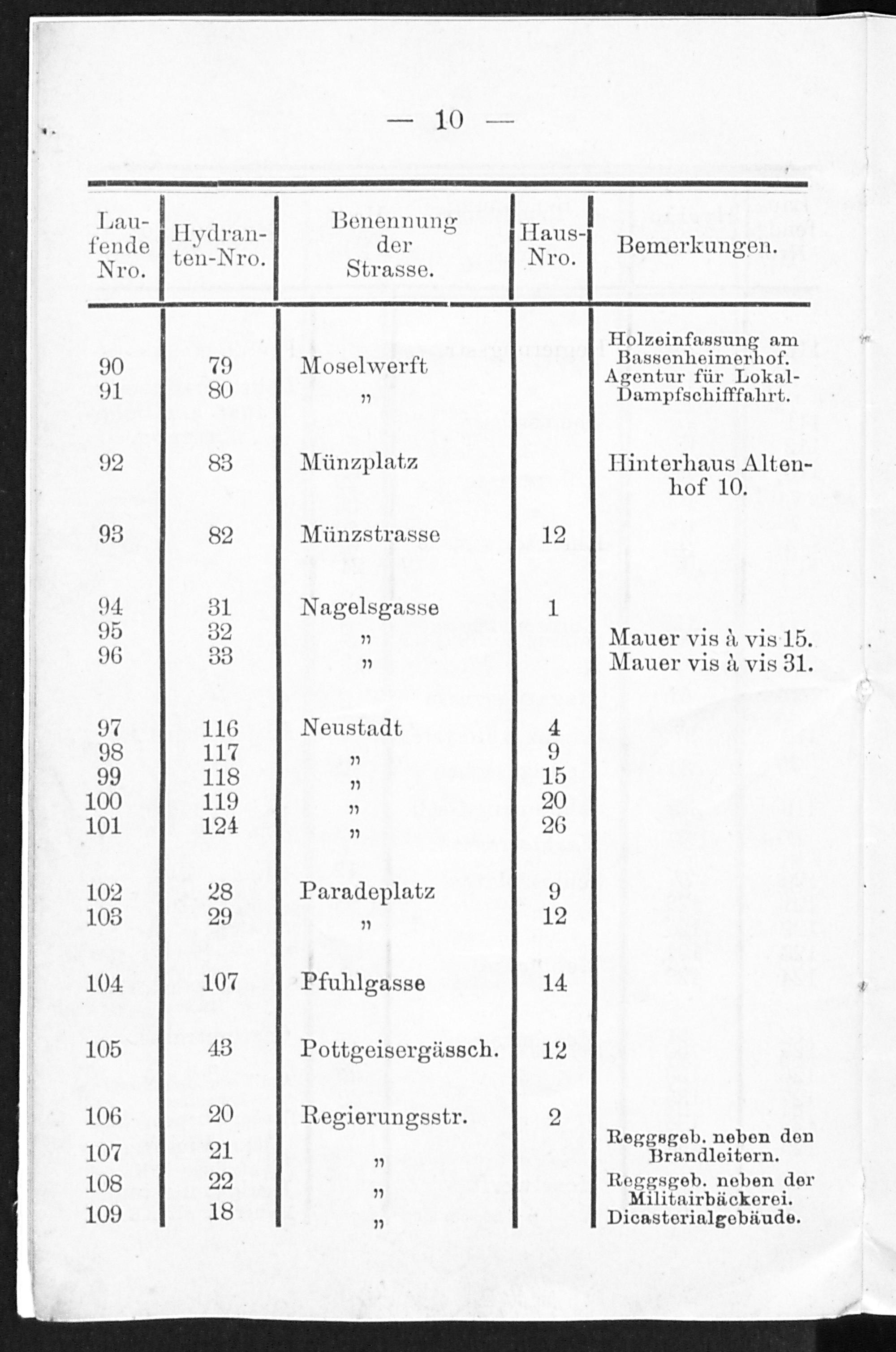 Verzeichniss der zur städtischen Wasserleitung in Coblenz gehörigen Hydranten