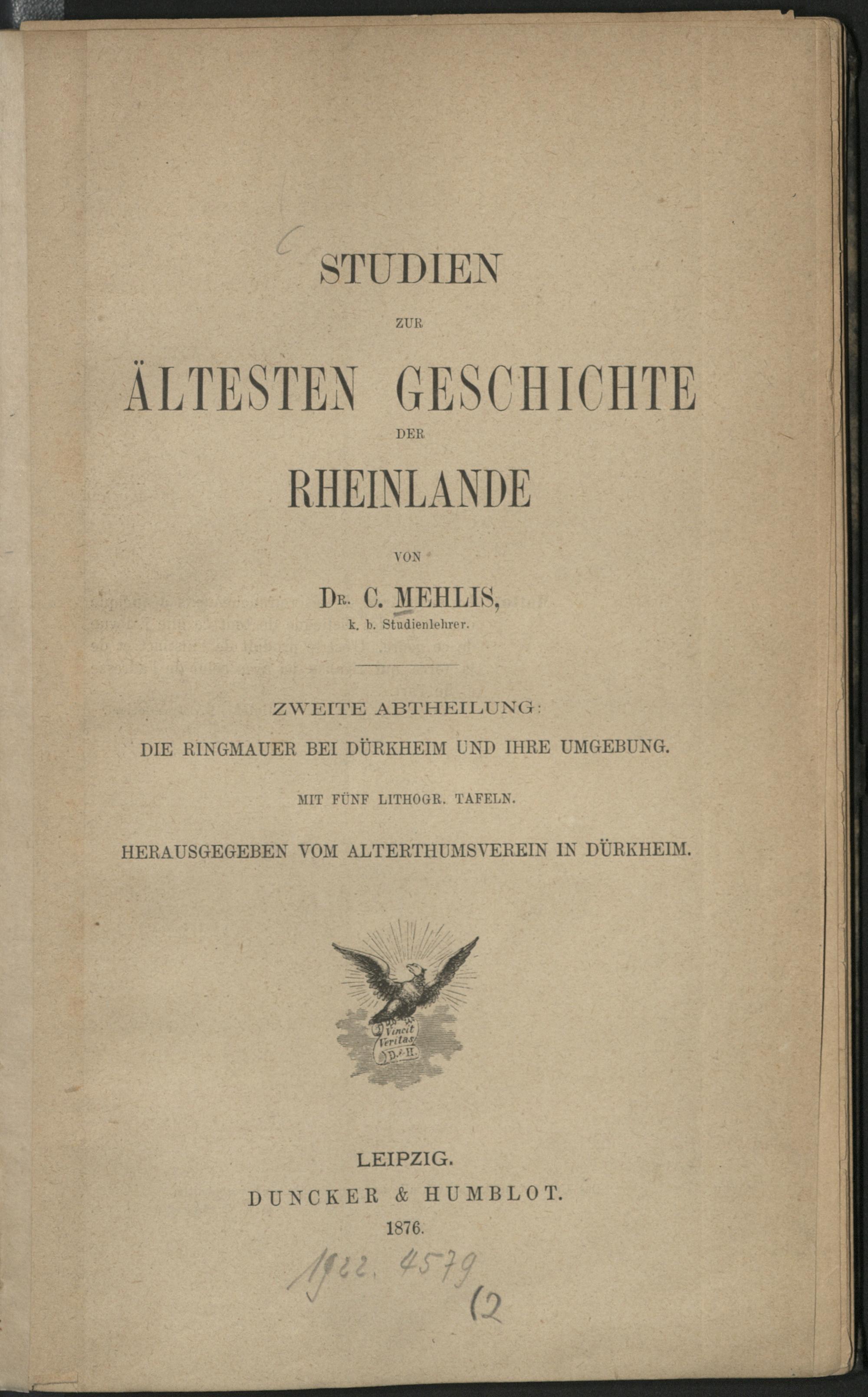 Die Ringmauer bei Dürkheim und ihre Umgebung : mit fünf lithogr. Tafeln / von C. Mehlis