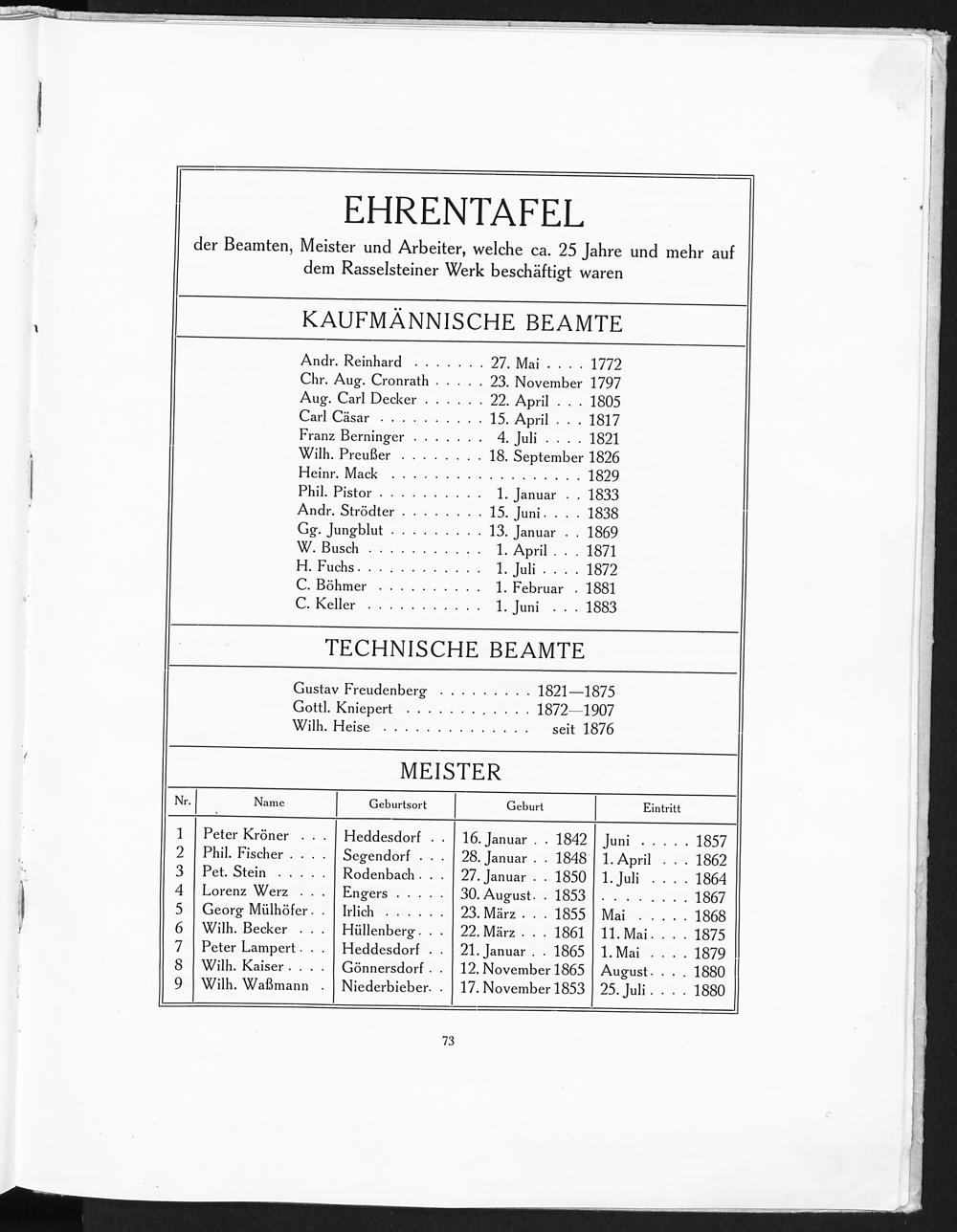 Ehrentafel der Beamten, Meister und Arbeiter, welche ca. 25 Jahre und mehr auf dem Rasselsteiner Werk beschäftigt waren